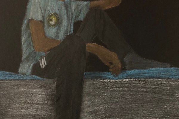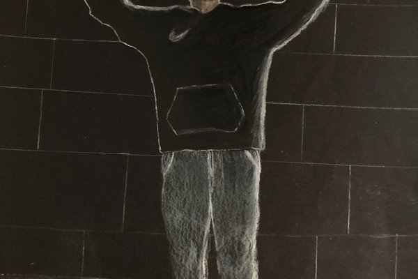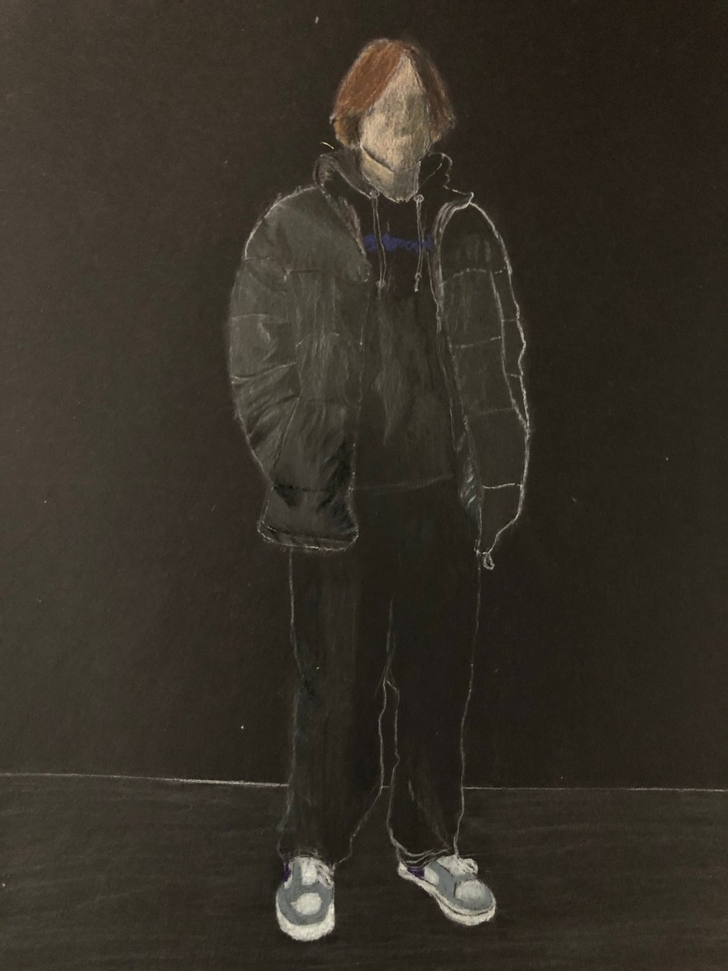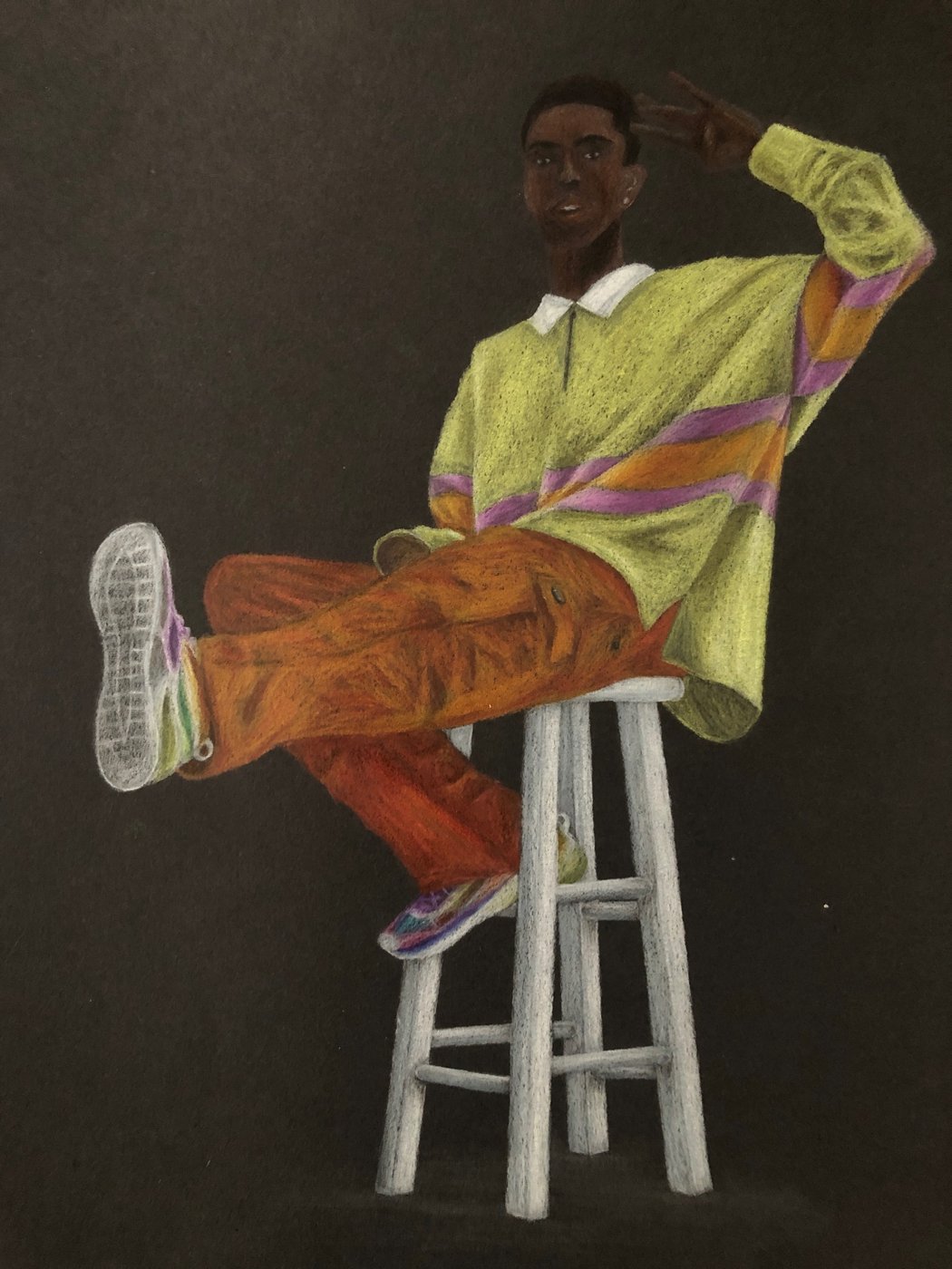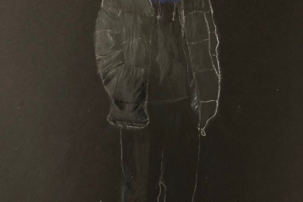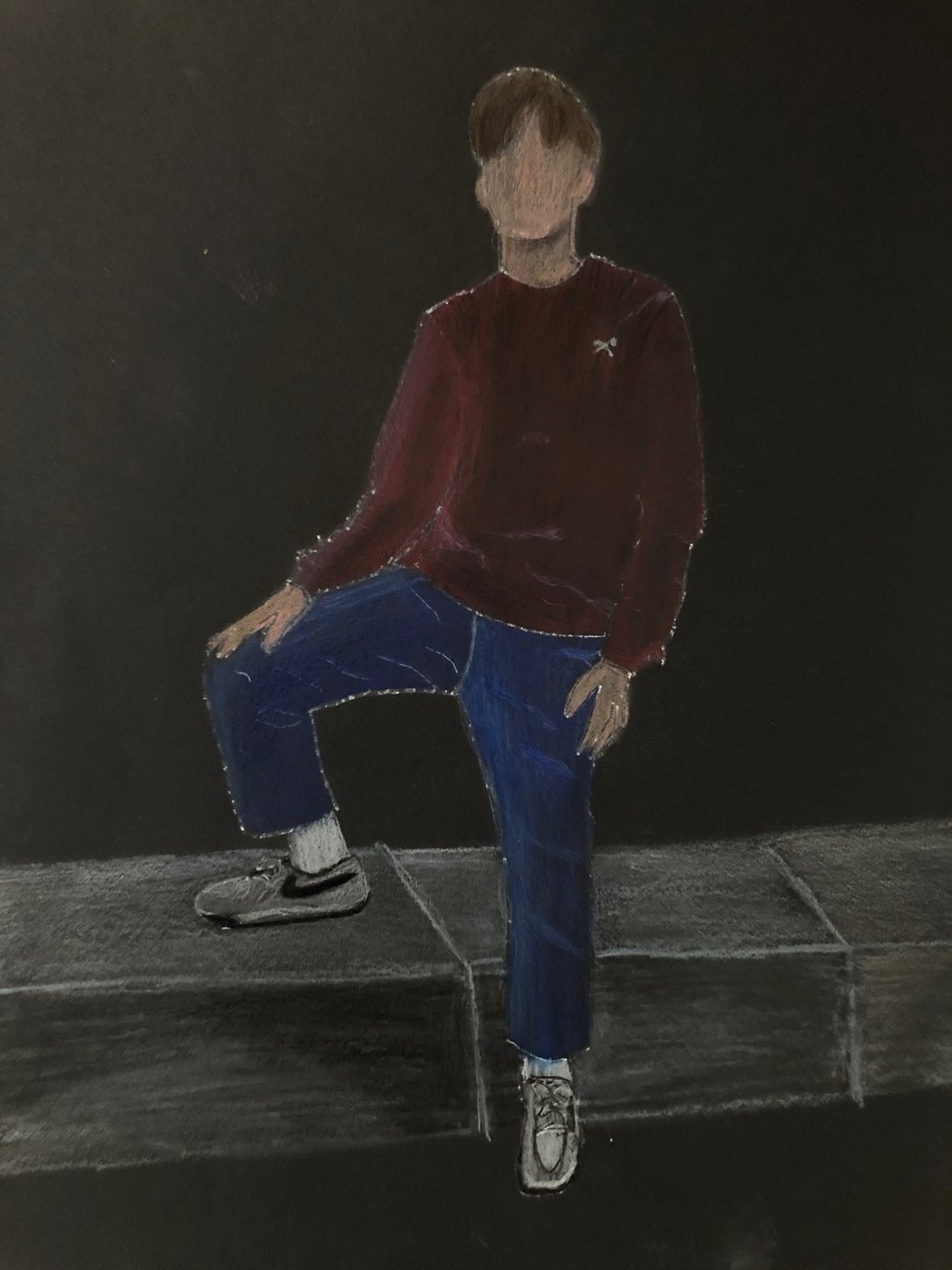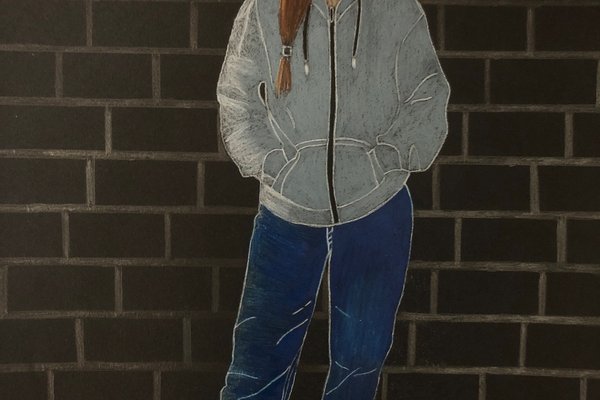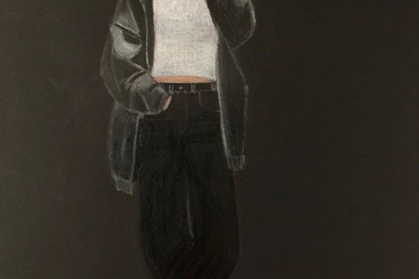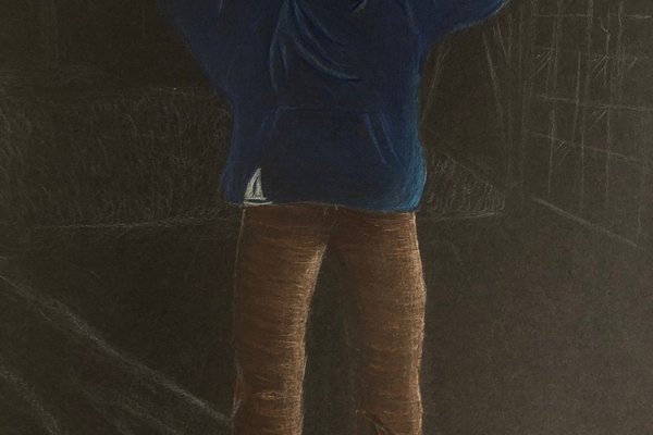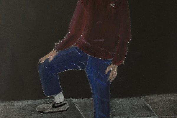 Die Schülerinnen und Schüler der B3ab haben sich gegenseitig fotografiert und danach ihre Fotografie zeichnerisch mit Farbstift auf schwarzem Papier umgesetzt.