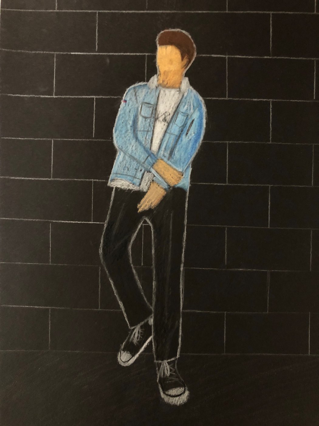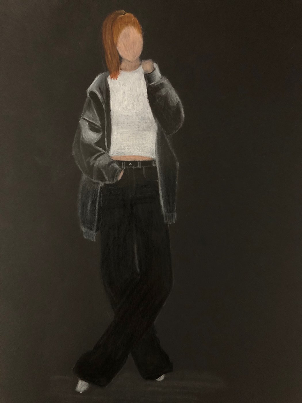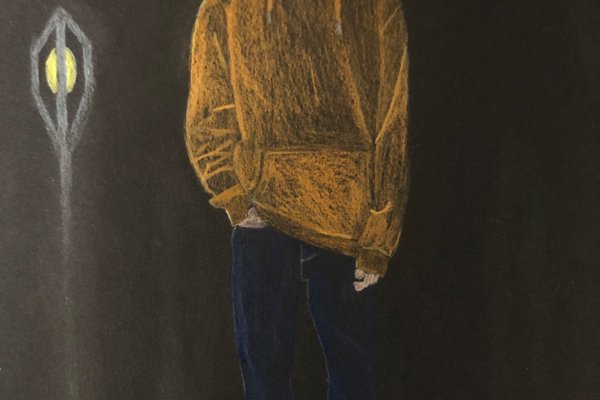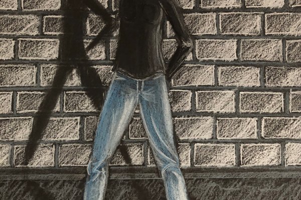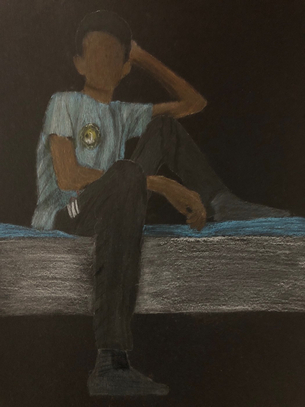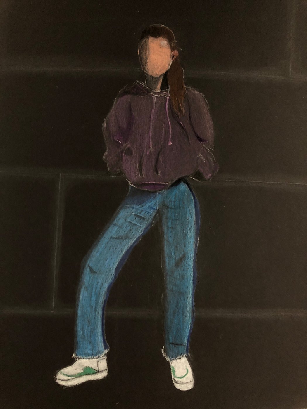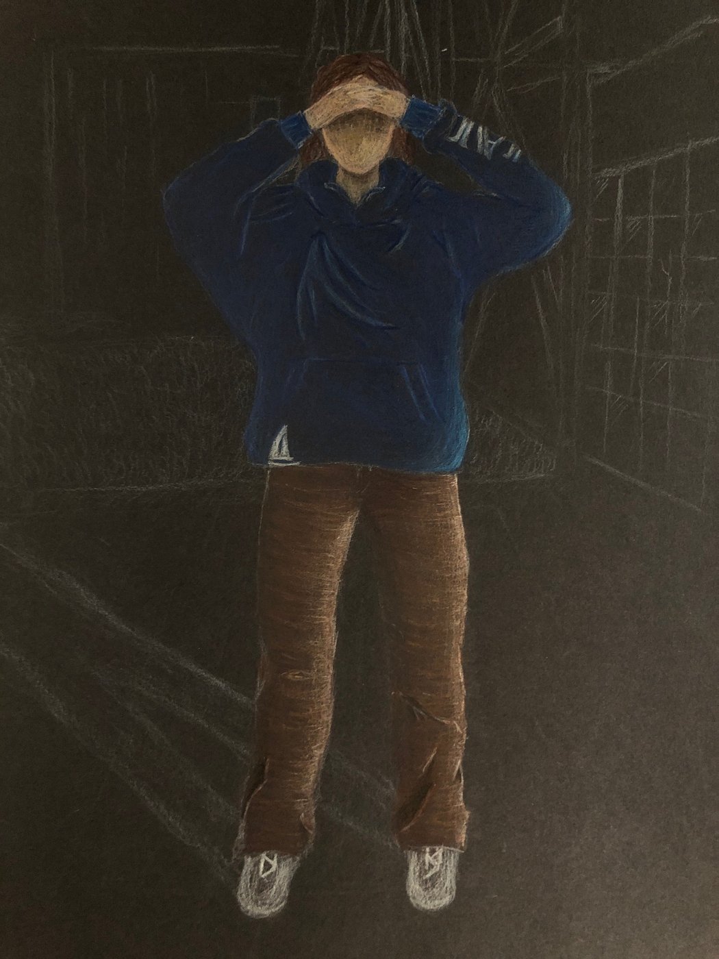 Die Schülerinnen und Schüler der B3ab haben sich gegenseitig fotografiert und danach ihre Fotografie zeichnerisch mit Farbstift auf schwarzem Papier umgesetzt.