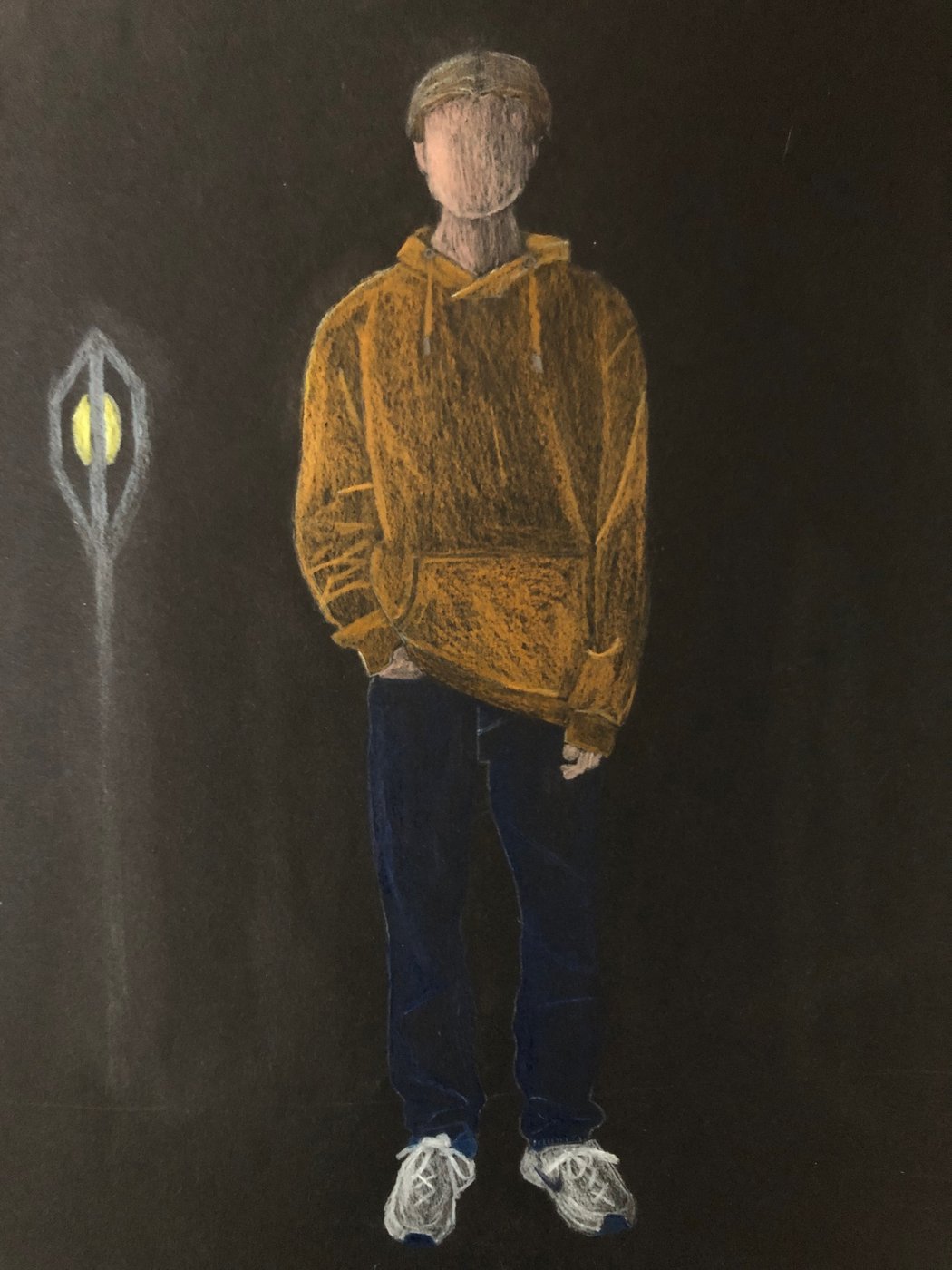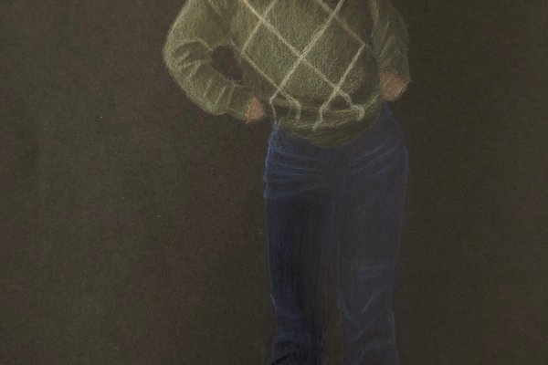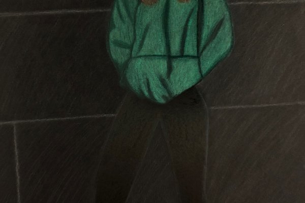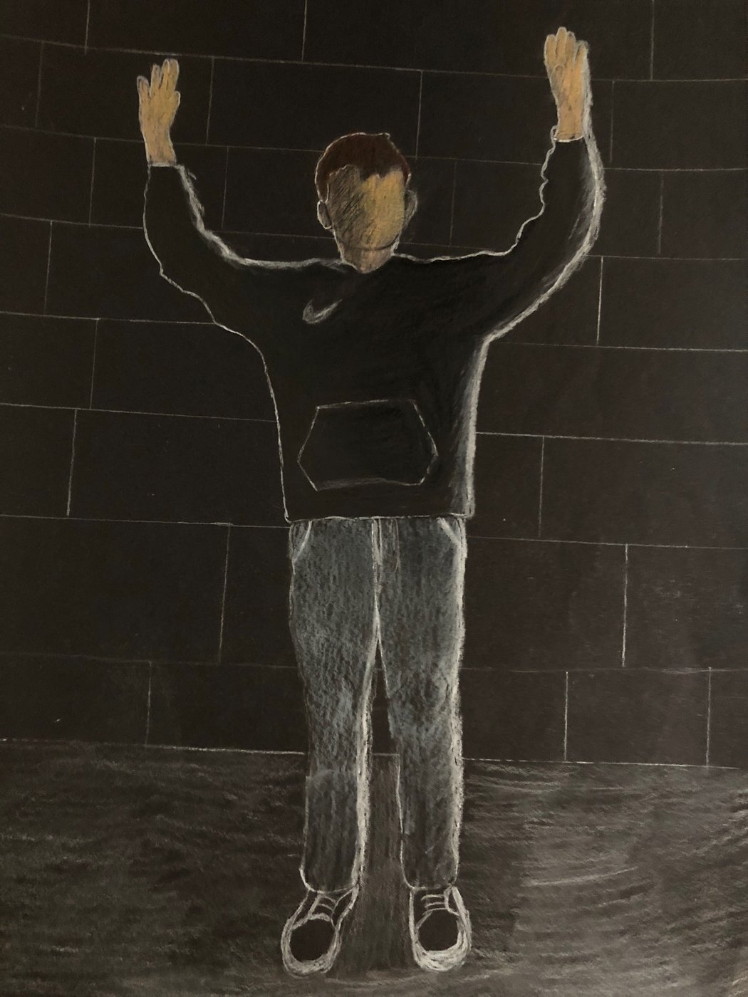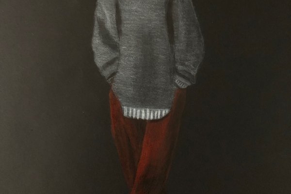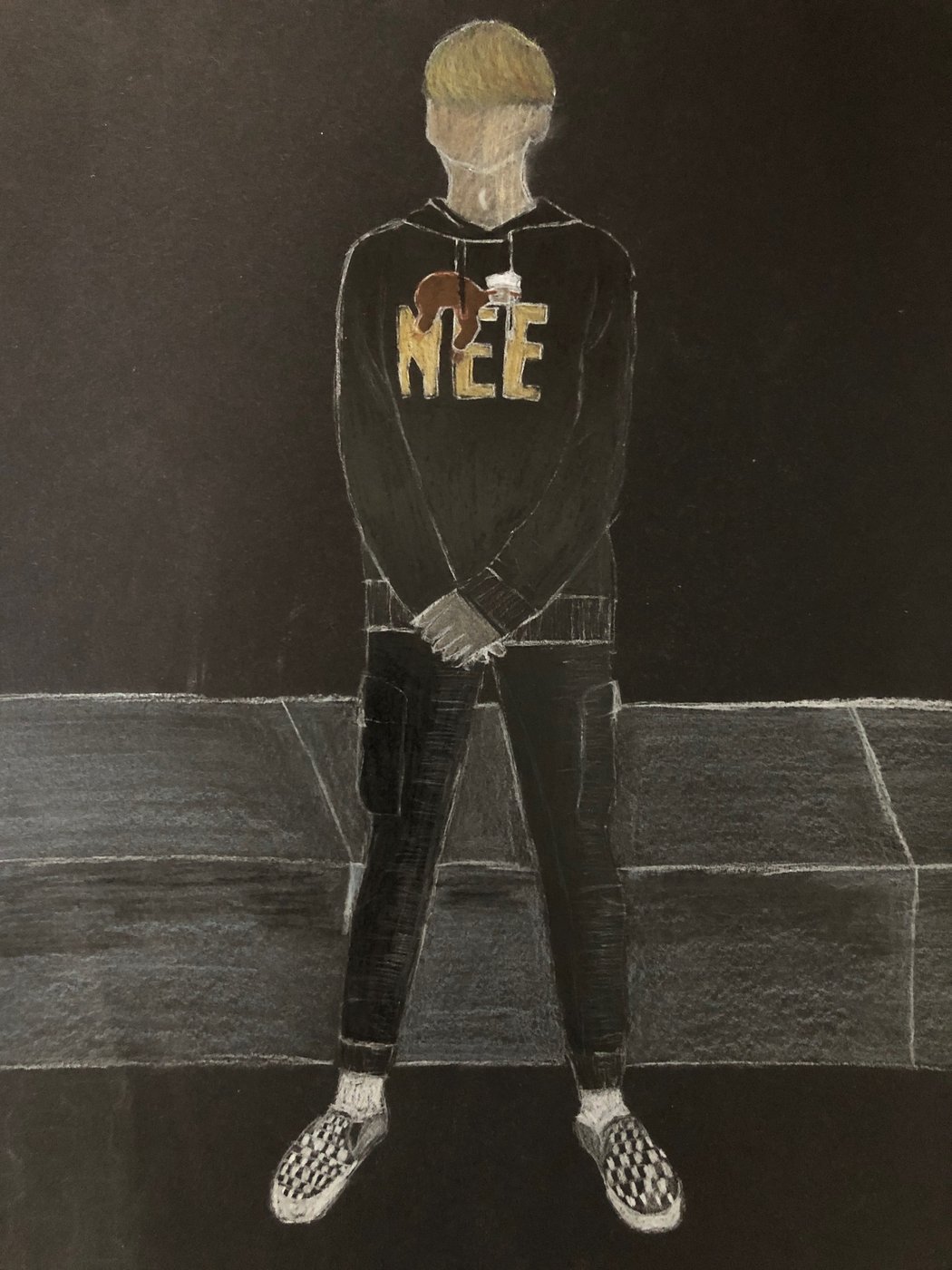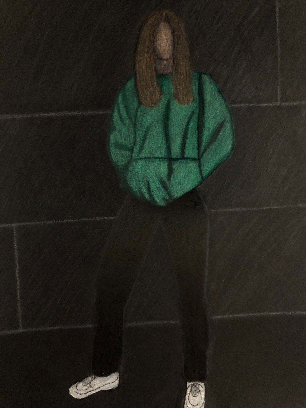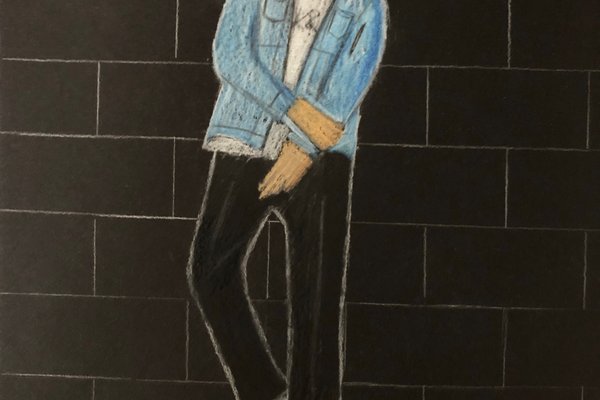 Die Schülerinnen und Schüler der B3ab haben sich gegenseitig fotografiert und danach ihre Fotografie zeichnerisch mit Farbstift auf schwarzem Papier umgesetzt.