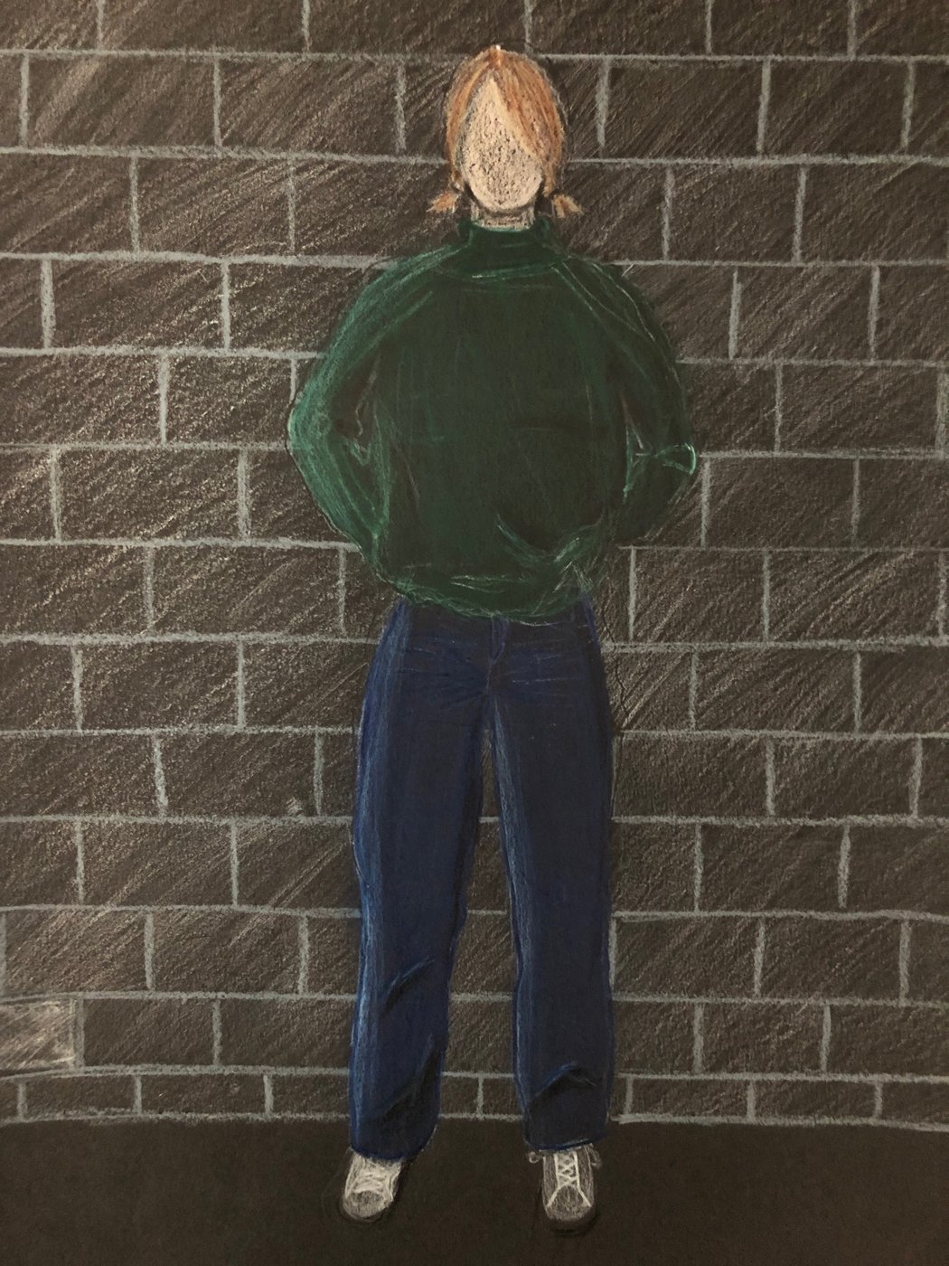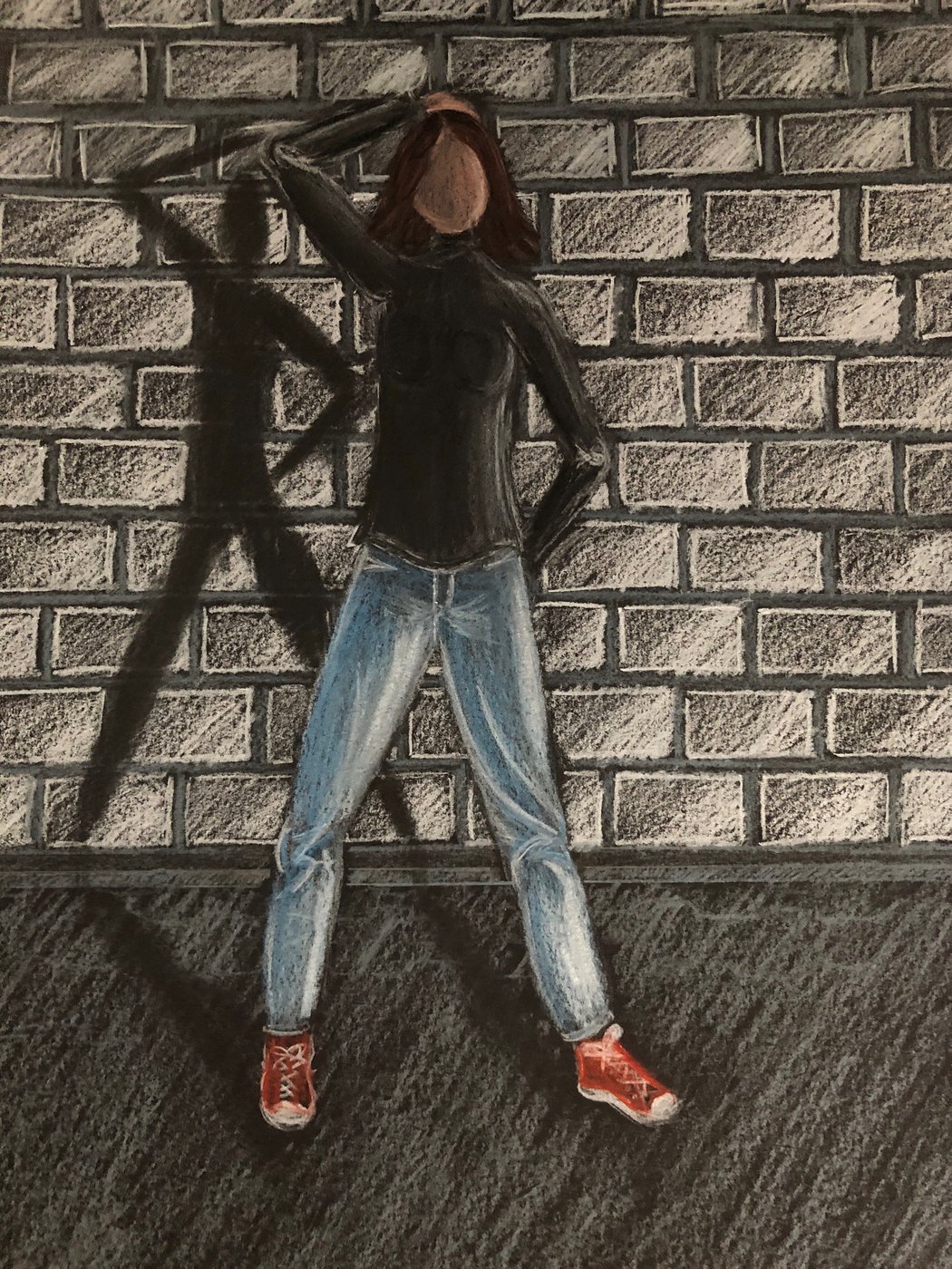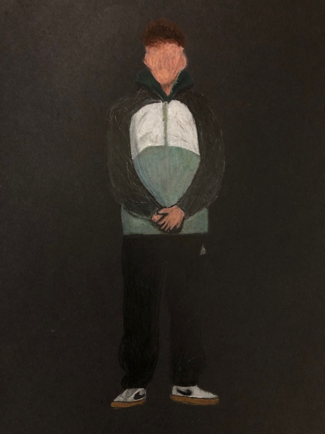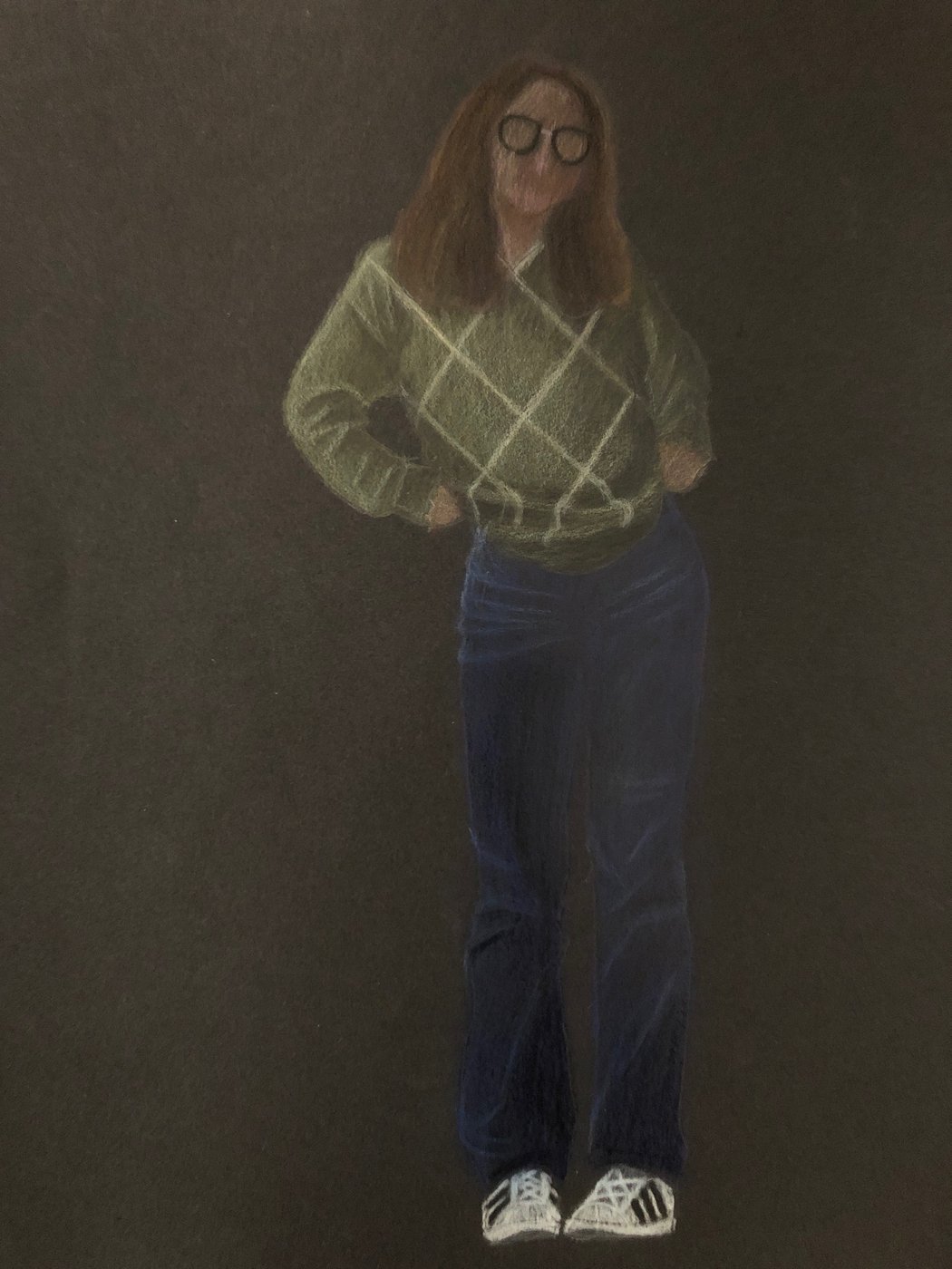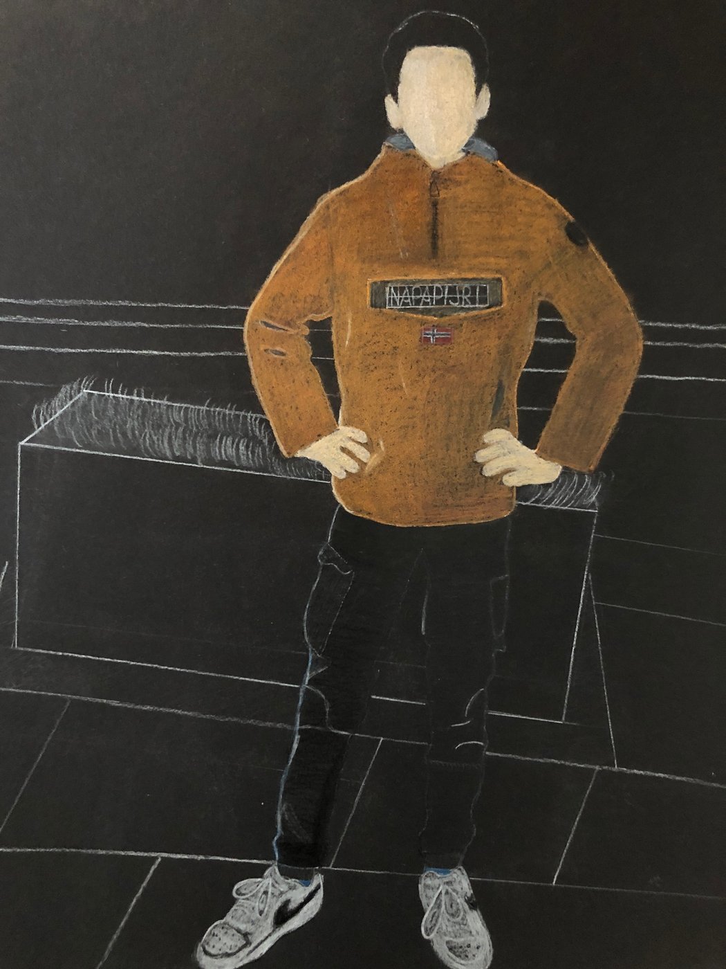 Die Schülerinnen und Schüler der B3ab haben sich gegenseitig fotografiert und danach ihre Fotografie zeichnerisch mit Farbstift auf schwarzem Papier umgesetzt.