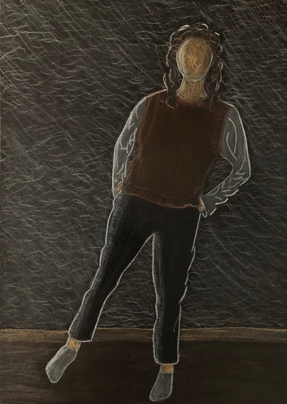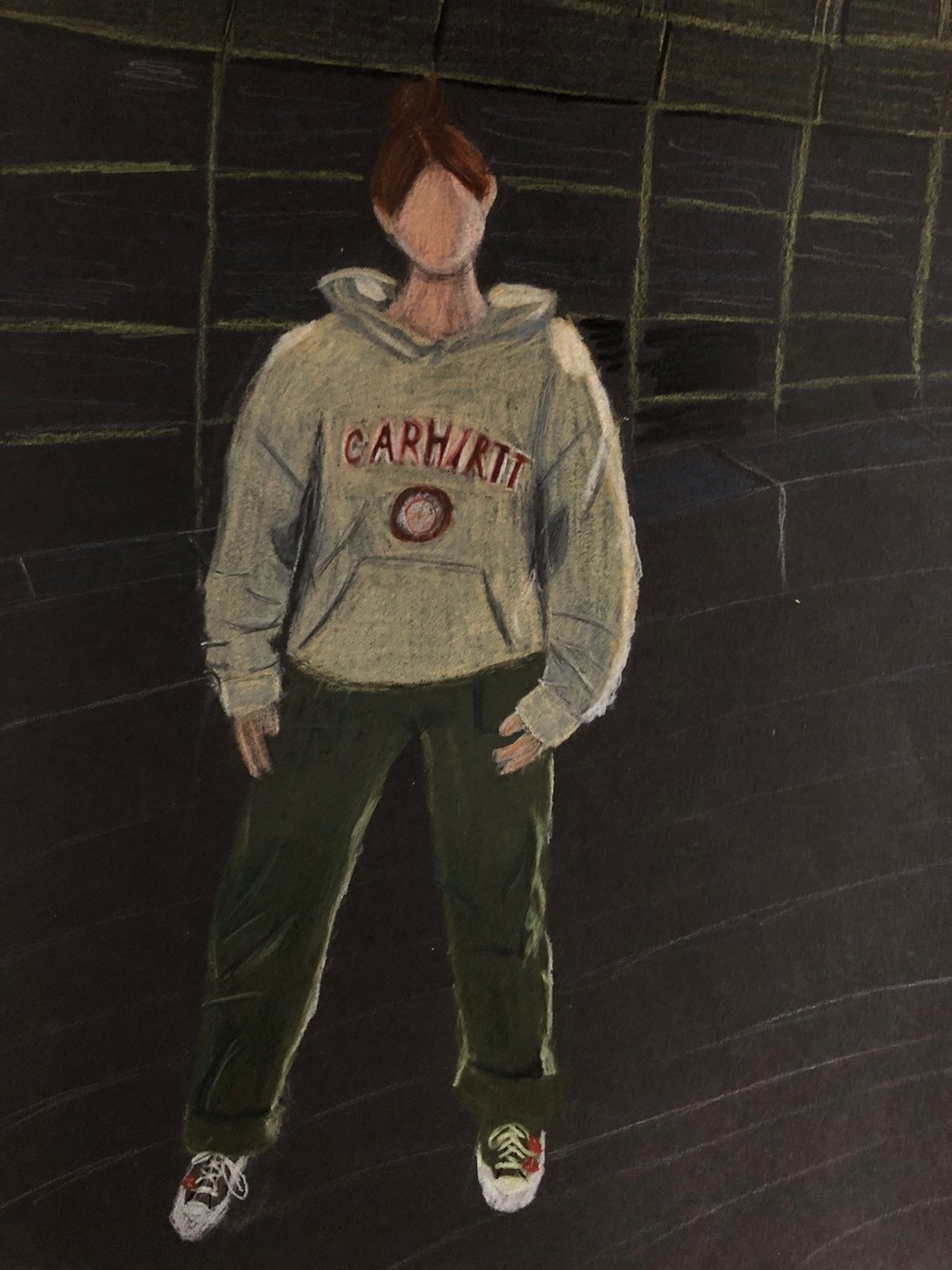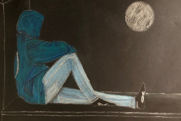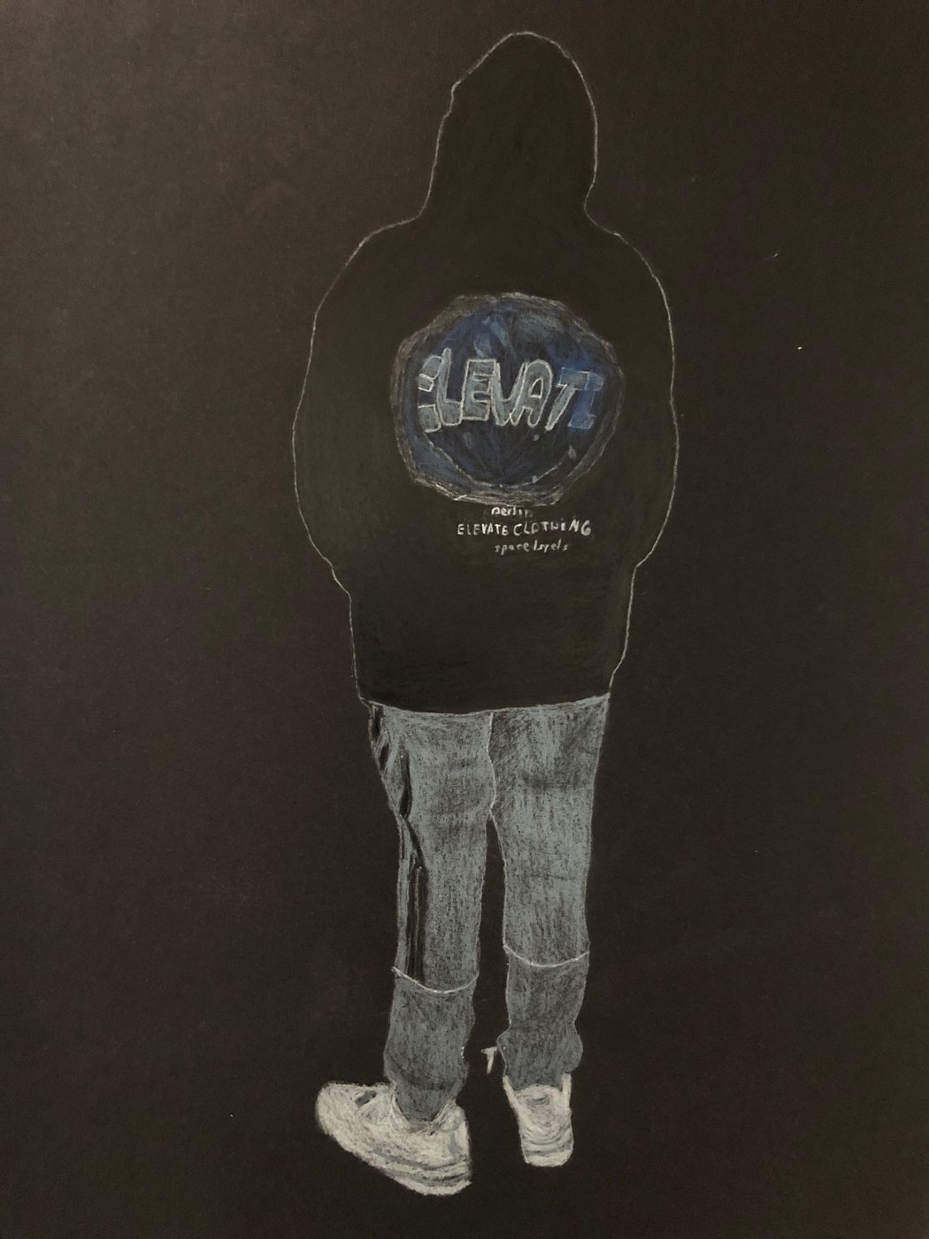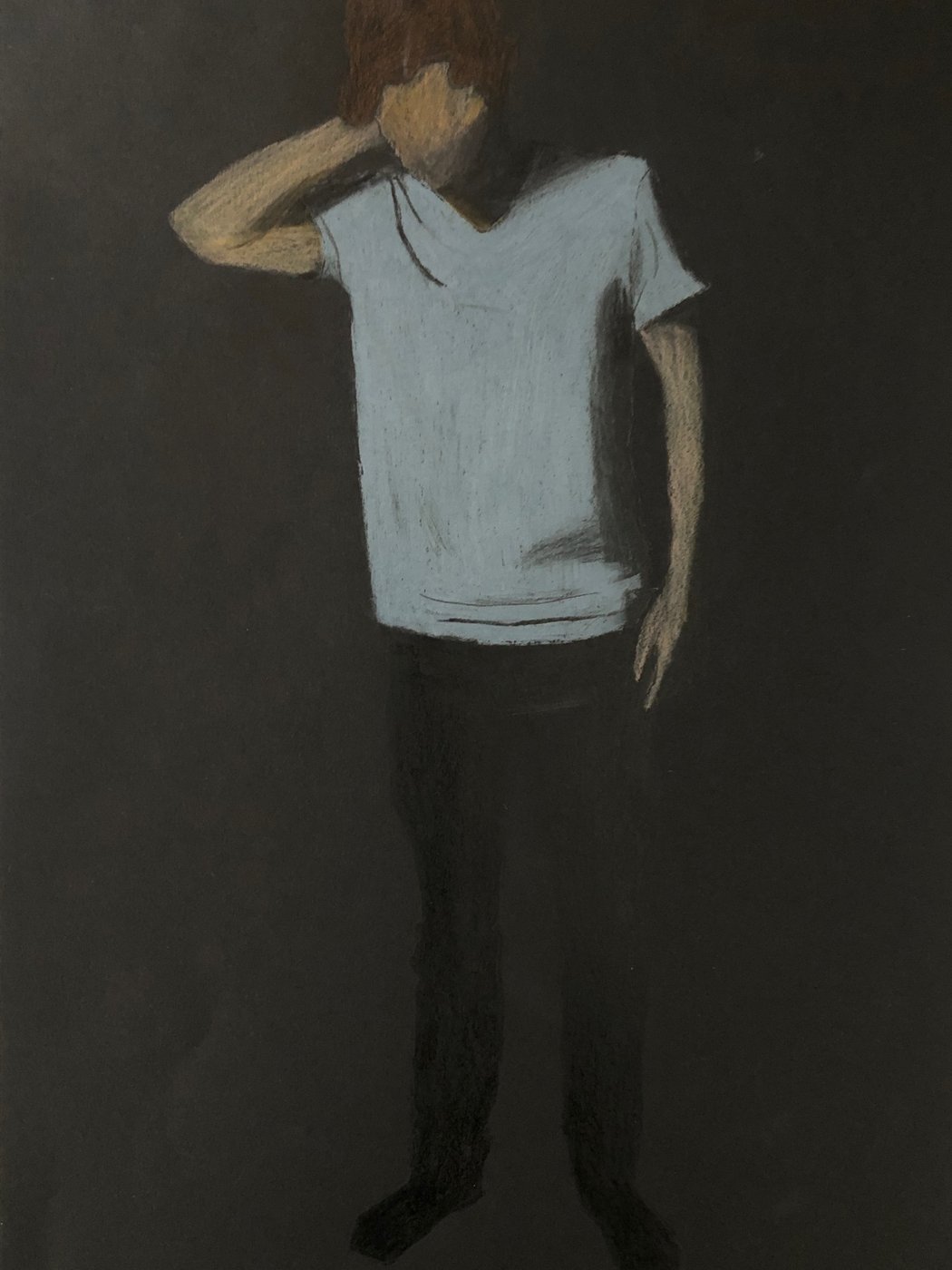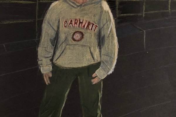 Die Schülerinnen und Schüler der B3ab haben sich gegenseitig fotografiert und danach ihre Fotografie zeichnerisch mit Farbstift auf schwarzem Papier umgesetzt.