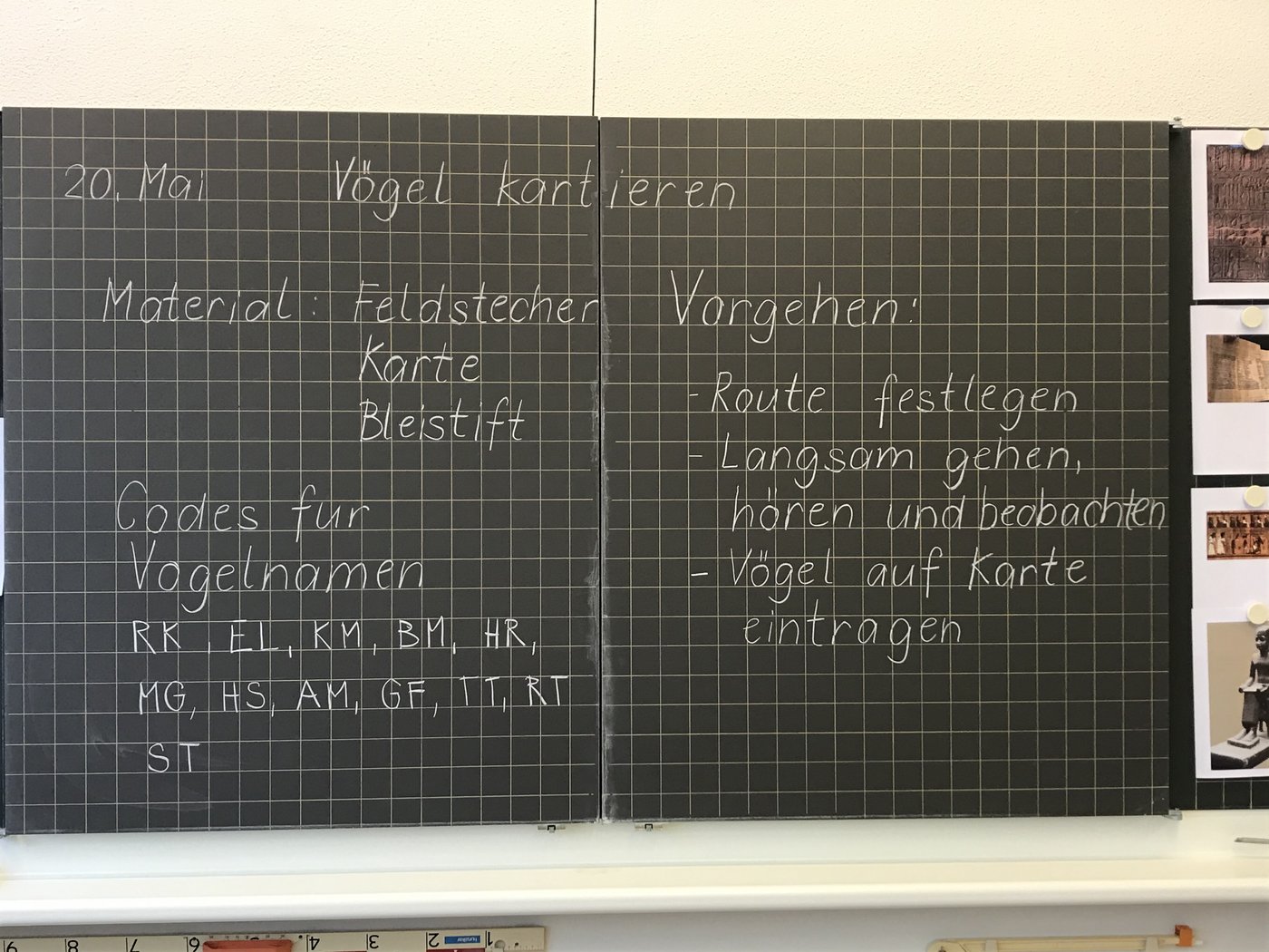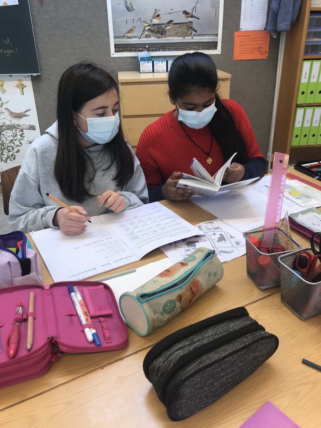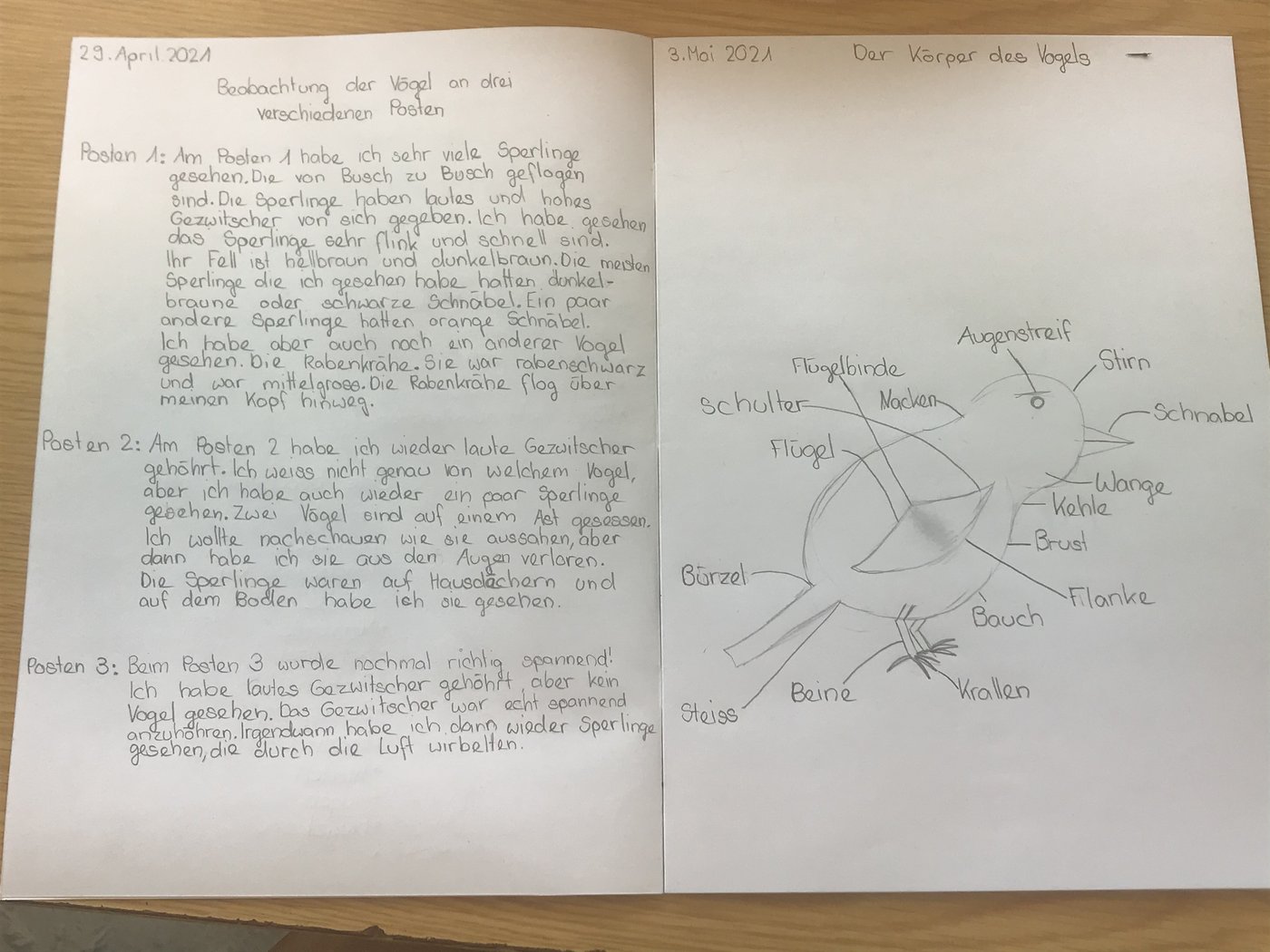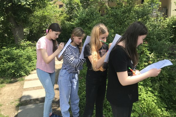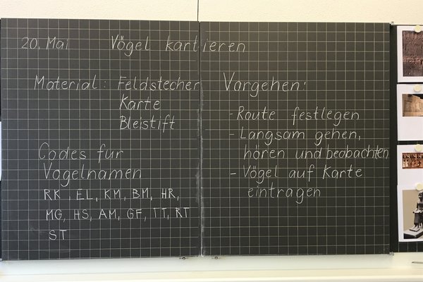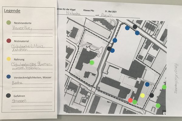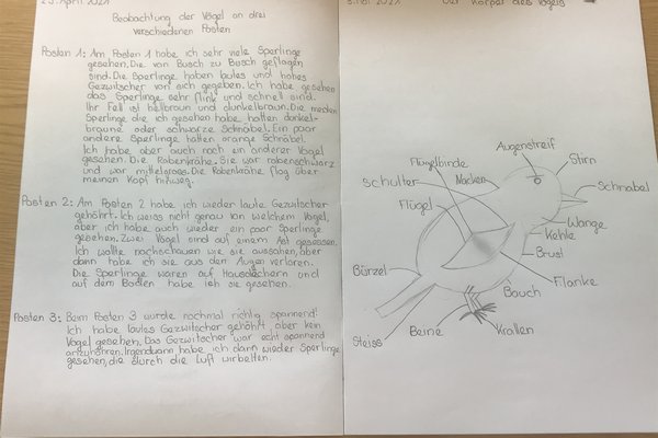 Ausgerüstet mit einem Situationsplan vom Schulgelände machten sich die Schülerinnen und Schüler am Anfang zu zweit auf ihre erste Vogelpirsch. Alle Beobachtungen wurden auf dem Plan eingezeichnet, alle Fragen wurden notiert.