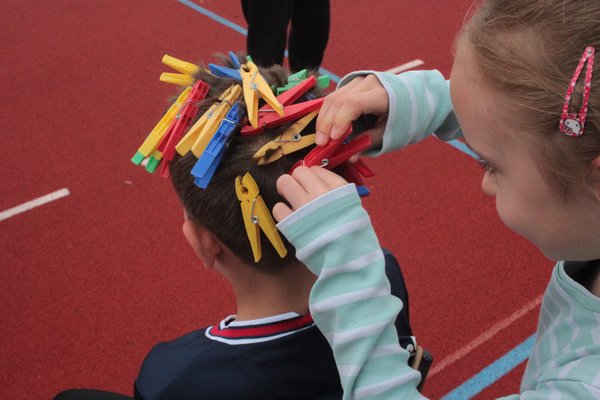 2) Wettlauf mit verschiedenen Aufgaben wie Klämmerlitransport und Smarties mit Löffel balancieren