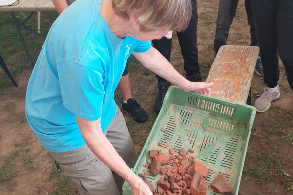 We could ask many questions and they were very patient. They had been working for some time and had already found animal bones, glass pieces and metal. But they told us they want to find a roman skeleton, because other archaeologists once found a skull at that location.They don't know where the skull is.Then they thought that they maybe will find the skeleton there. After that we played in the Amphitheater and had lots of fun.