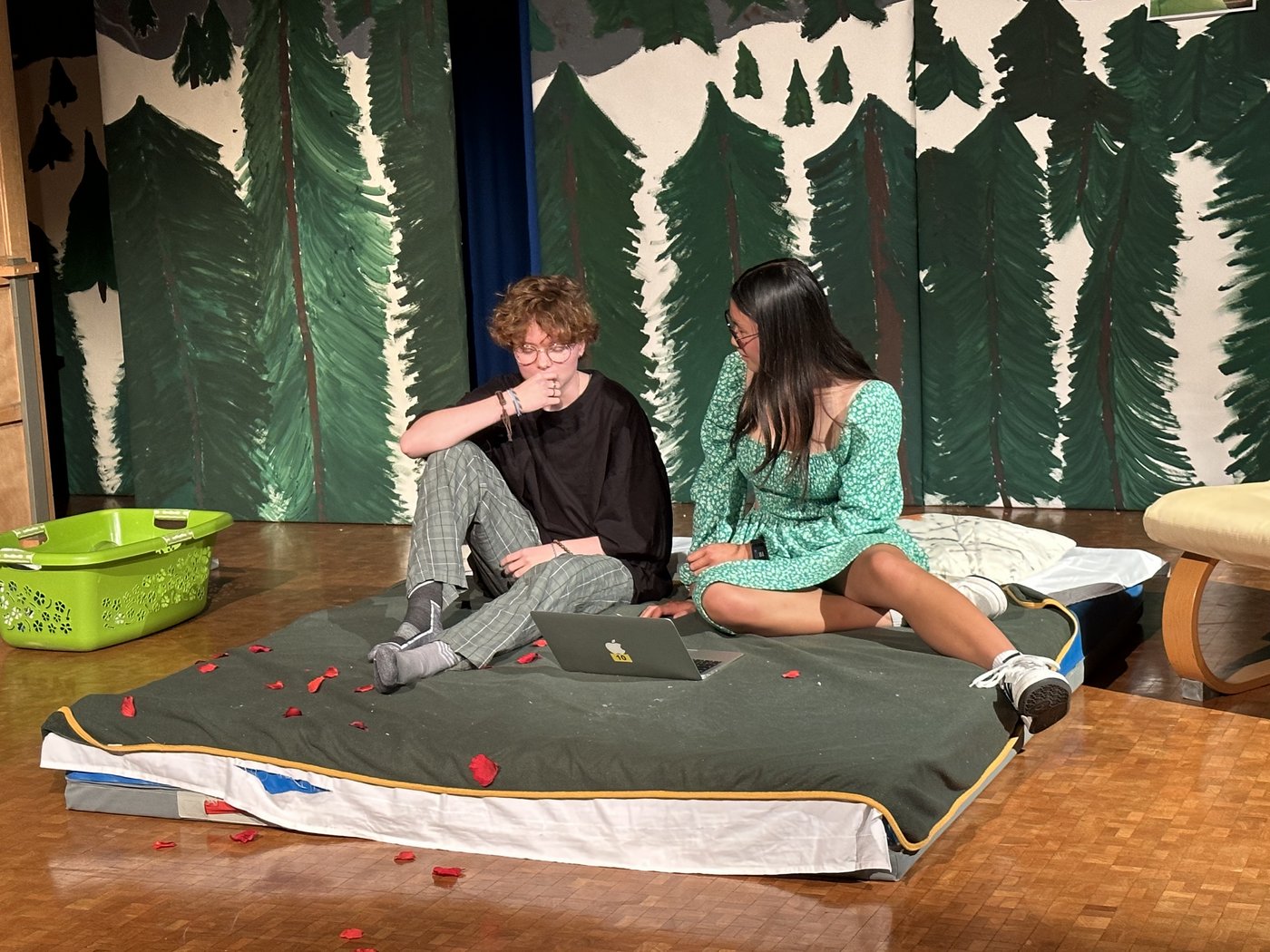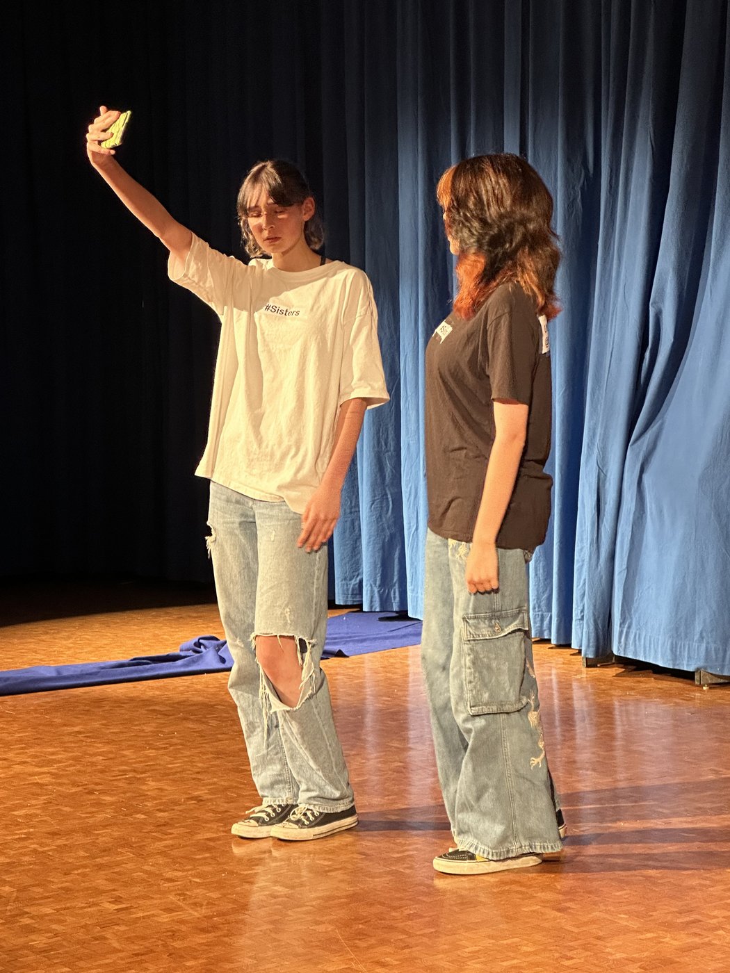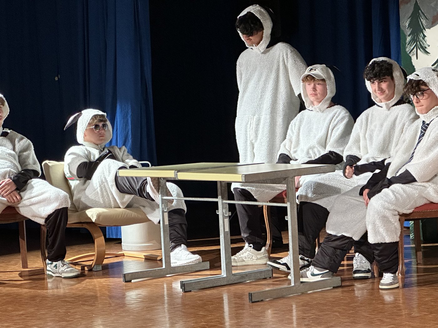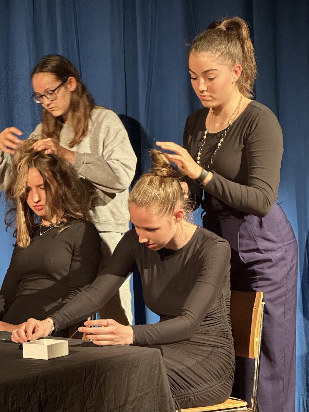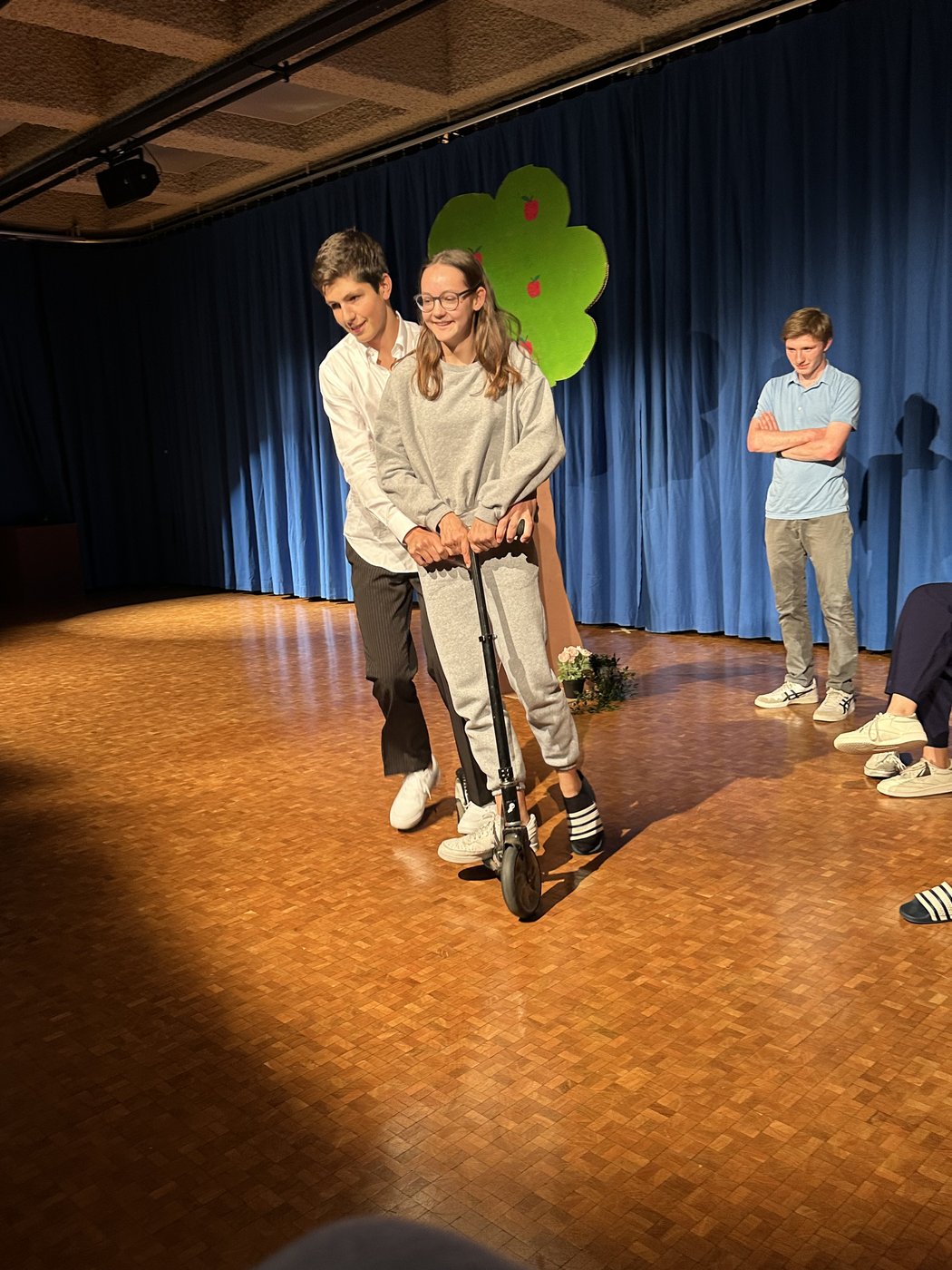 Die Zeit raste in Richtung Aufführung. Während die Theatergruppen immer mehr Fortschritte erreichten und langsam zu proben begannen, schrieb die Moderation ihr Skript für die Zwischenacts und entwarf einen Flyer für das Theater. Die Technik, meistens mit dem Kennenlernen des Soundboards und des Lichtpultes beschäftigt, erhielt zwischenzeitlich Nachhilfe von Technikprofi Urs Kuster. Und dann, nach zweiwöchiger Hauptprobe war es soweit: Das Märchentheater „D Storys vo de Grimm-Bros chli andersch“ der beiden dritten Bezirksschulklassen stand vor der Türe!