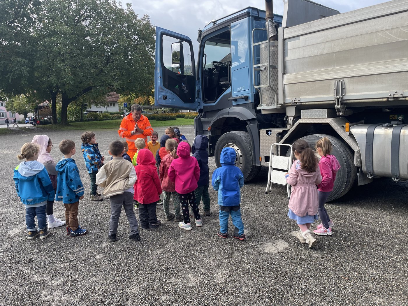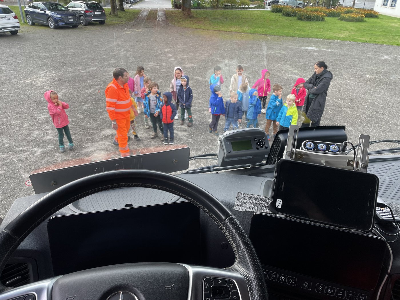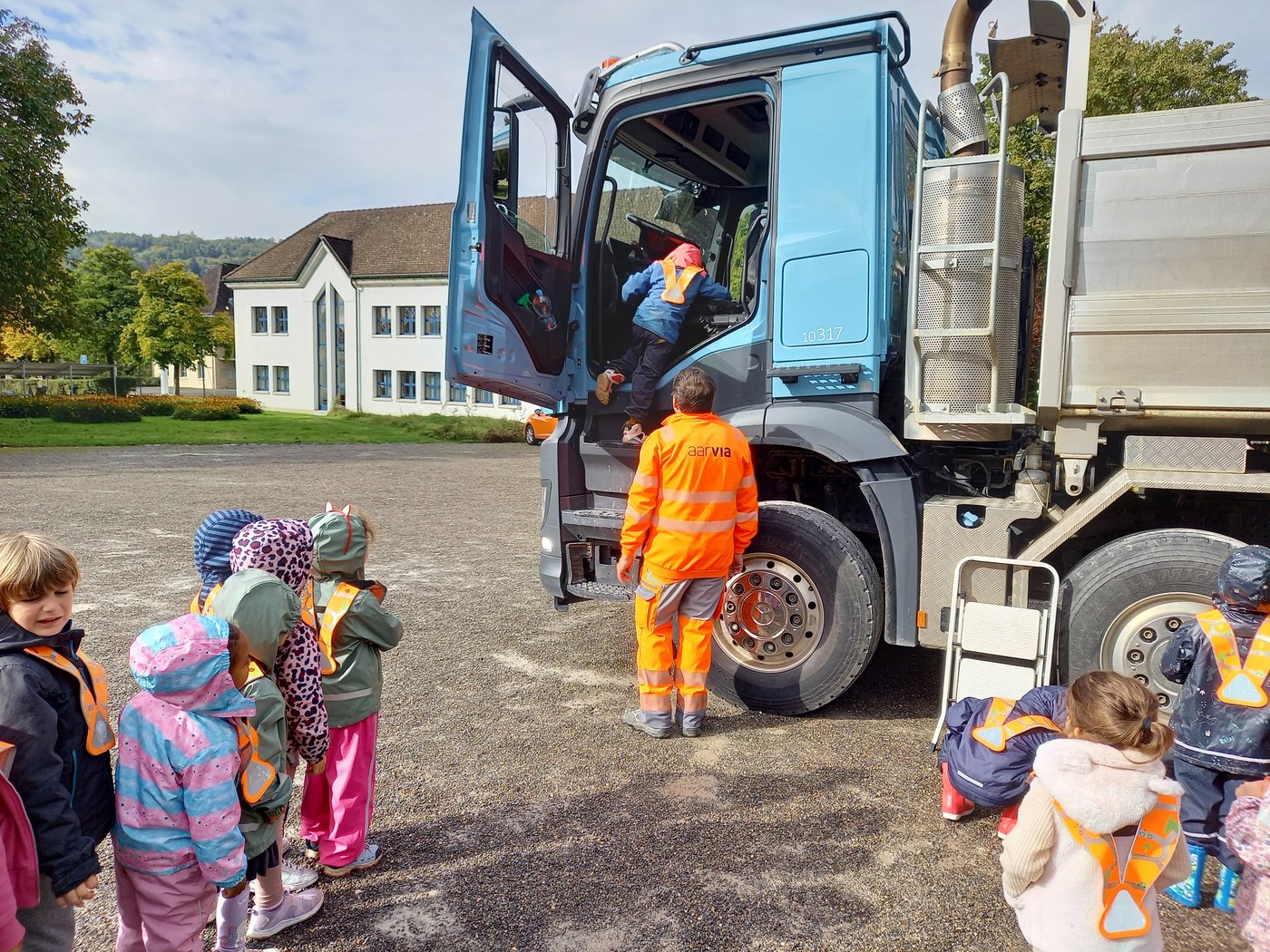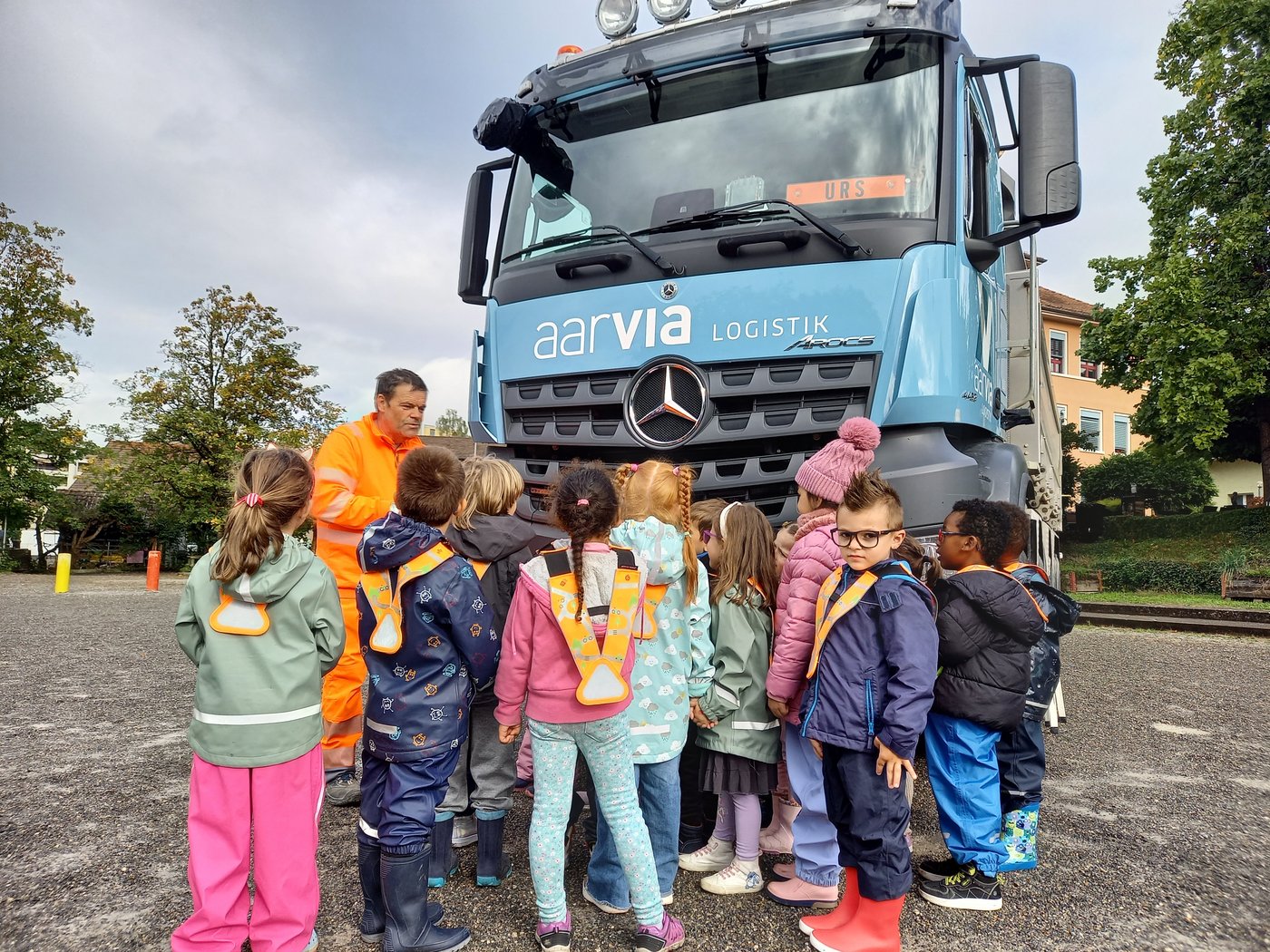 In den Tagen vor den Herbstferien durften viele Kinder des Kindergartens und der Unterstufe einen Lastwagen hautnah erleben. Auf dem Kiesparkplatz beim Gemeindehaus stand das grosse Gefährt der Firma Aarvia. Um die Verkehrssicherheit der jungen Schülerinnen und Schüler zu erhöhen, wurde das richtige Verhalten im Umgang mit einem Lastwagen trainiert. Bei einem Rundgang um den Lastwagen erfuhren die Kinder eindrücklich, wo man vom Chauffeur gesehen und wo man nicht gesehen wird. Das absolute Highlight für die Kinder aber war das Einsteigen in die Führerkabine. Beim Auf- und Einstieg wurden die Dimensionen deutlich spürbar.