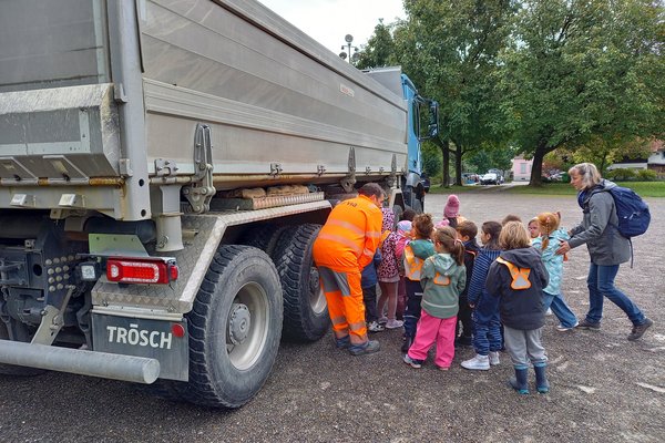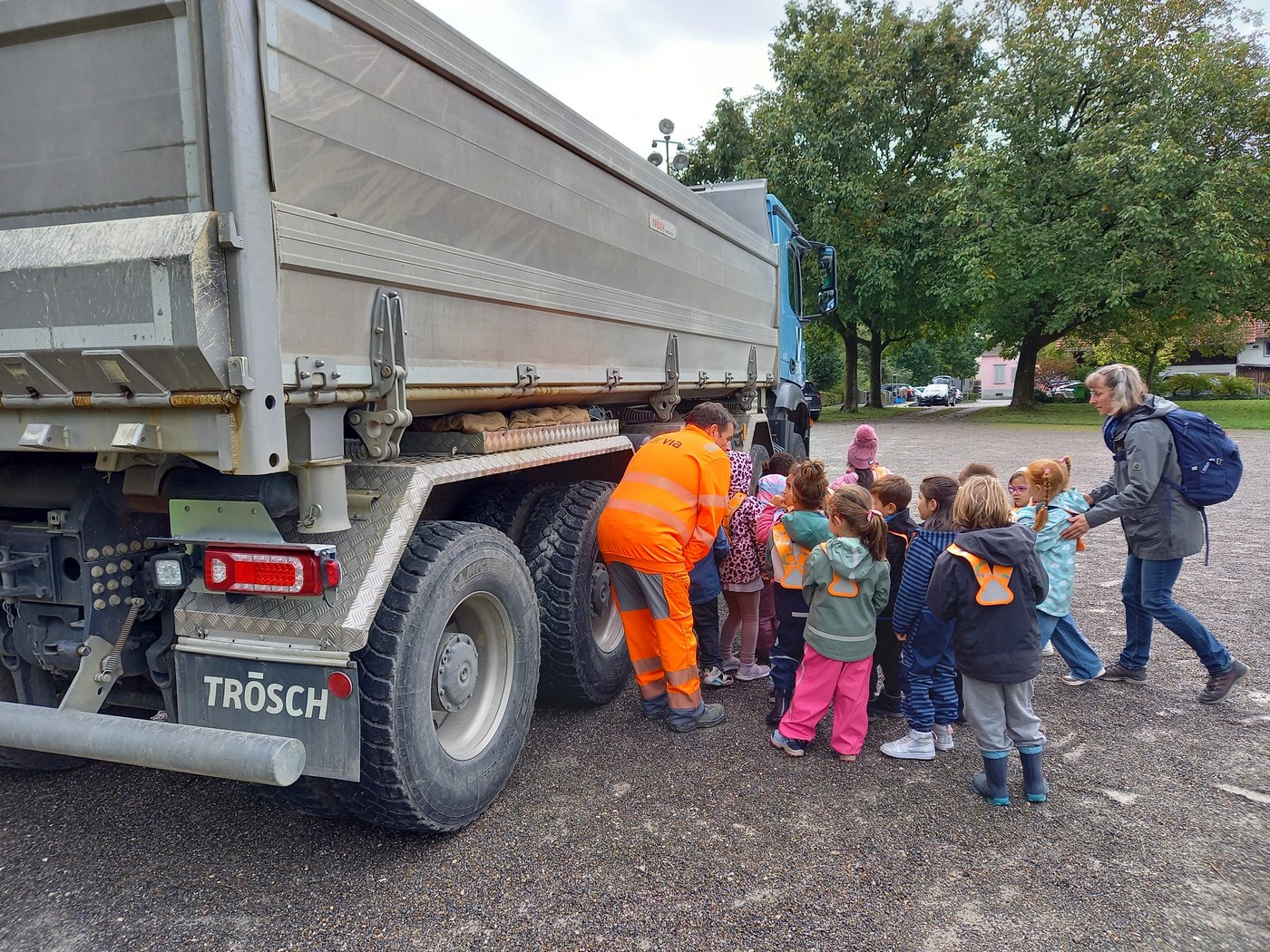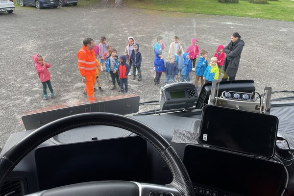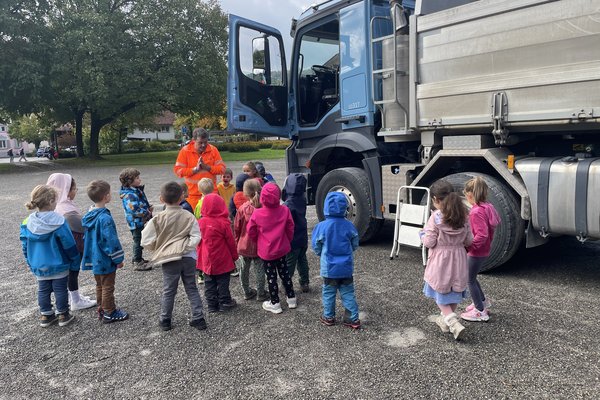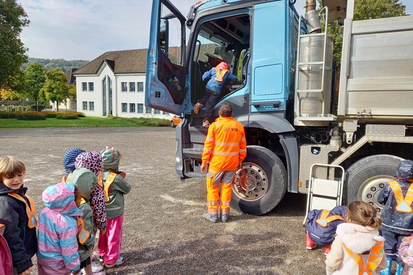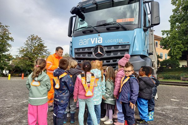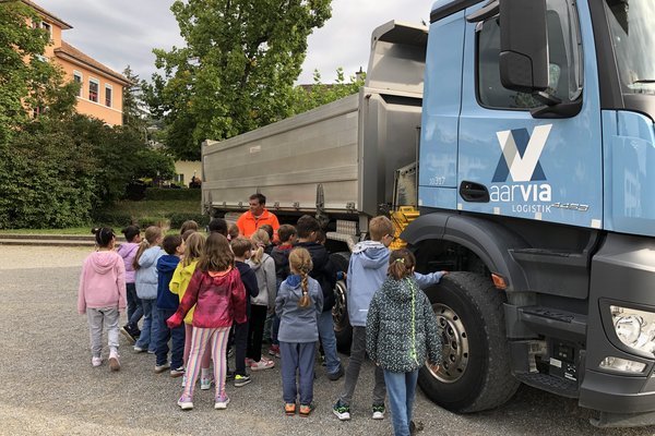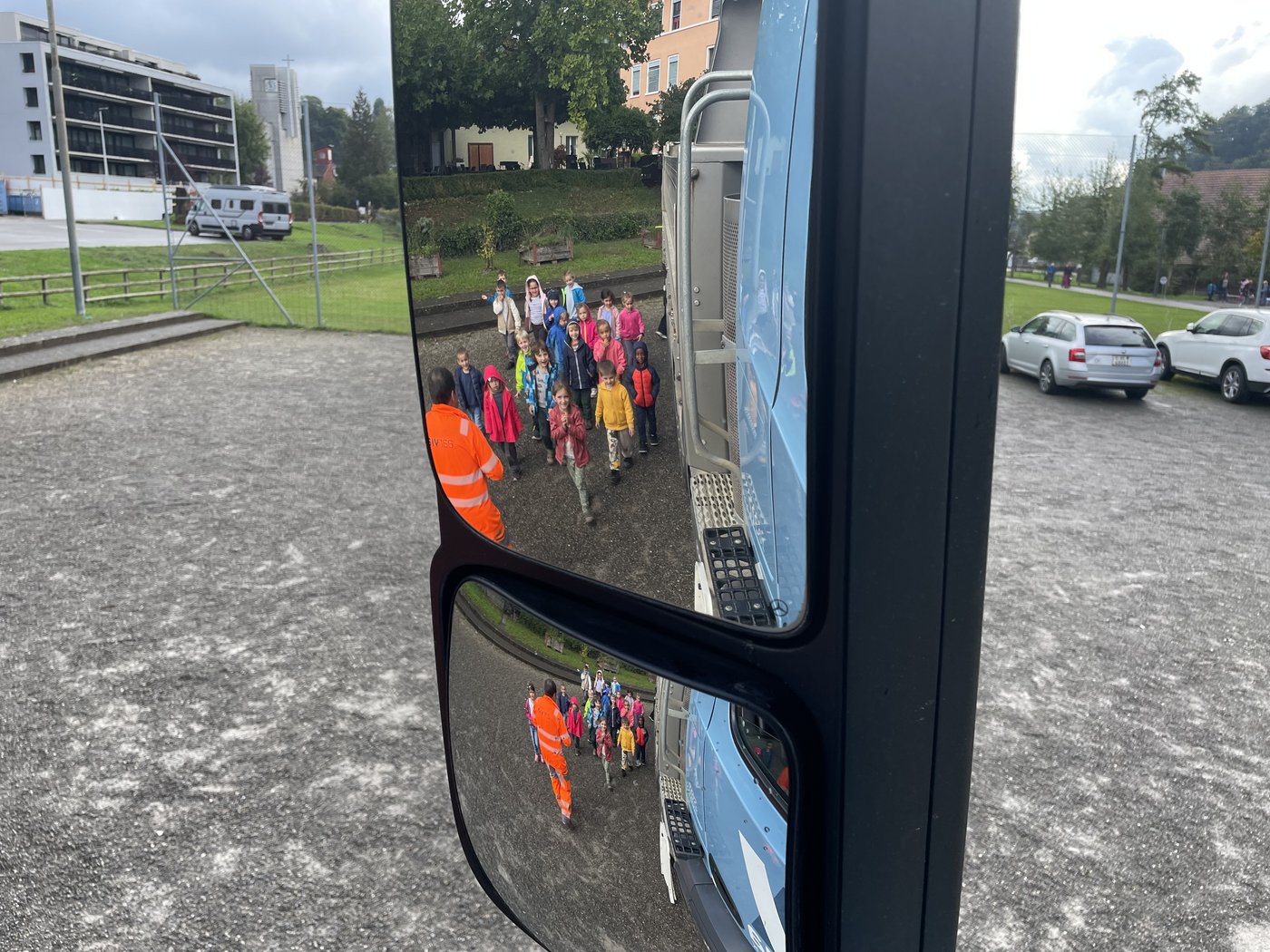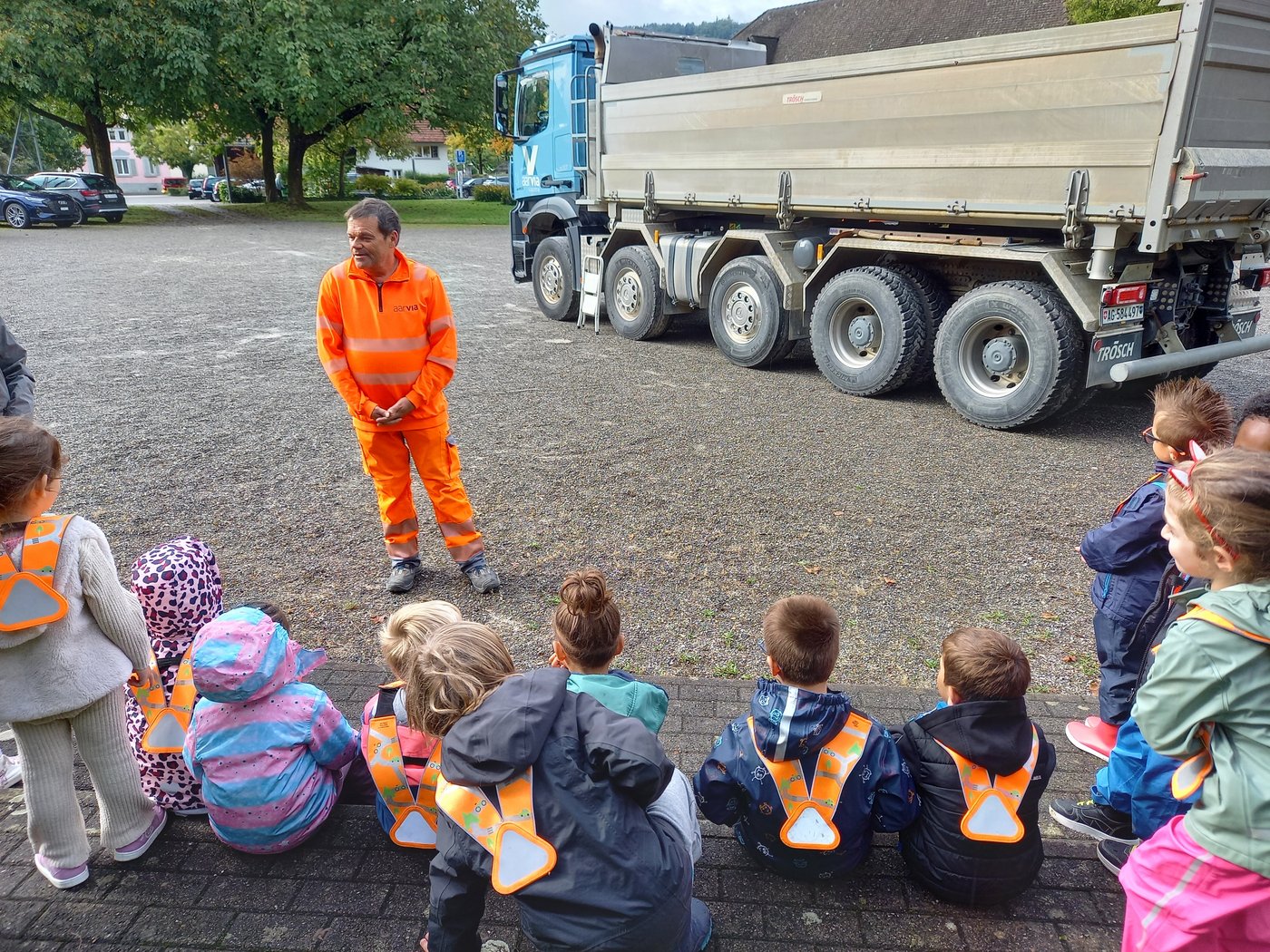 In den Tagen vor den Herbstferien durften viele Kinder des Kindergartens und der Unterstufe einen Lastwagen hautnah erleben. Auf dem Kiesparkplatz beim Gemeindehaus stand das grosse Gefährt der Firma Aarvia. Um die Verkehrssicherheit der jungen Schülerinnen und Schüler zu erhöhen, wurde das richtige Verhalten im Umgang mit einem Lastwagen trainiert. Bei einem Rundgang um den Lastwagen erfuhren die Kinder eindrücklich, wo man vom Chauffeur gesehen und wo man nicht gesehen wird. Das absolute Highlight für die Kinder aber war das Einsteigen in die Führerkabine. Beim Auf- und Einstieg wurden die Dimensionen deutlich spürbar.