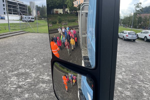 Wie bewege ich mich sicher an einem Lastwagen vorbei? Diese Frage stand im Zentrum der Übung. Schnell wurde klar: Je weiter weg ich vom Lastwagen stehe, umso sichtbarer werde ich! Beeindruckt hat auch die Tatsache, dass 30 Personen vor dem Lastwagen stehen können, ohne von der Fahrerin oder dem Fahrer gesehen zu werden! Deshalb ist es sehr wichtig, das richtige Verhalten zu kennen, um sich nicht in Gefahr zu begeben.