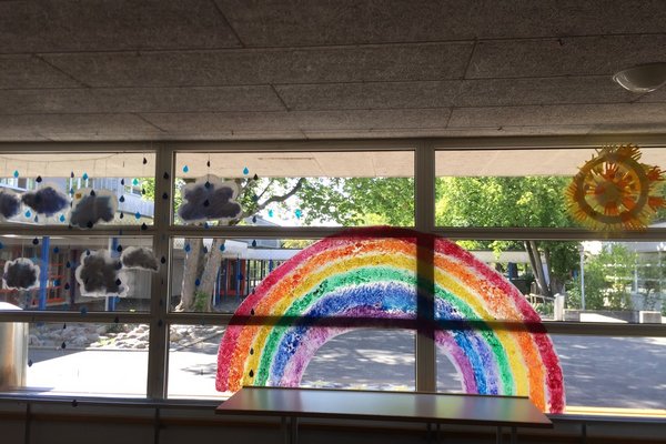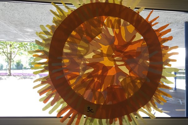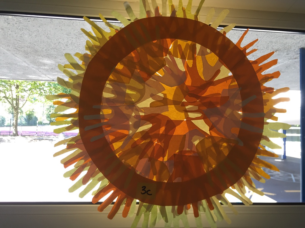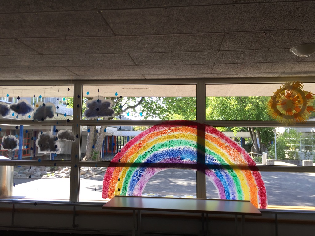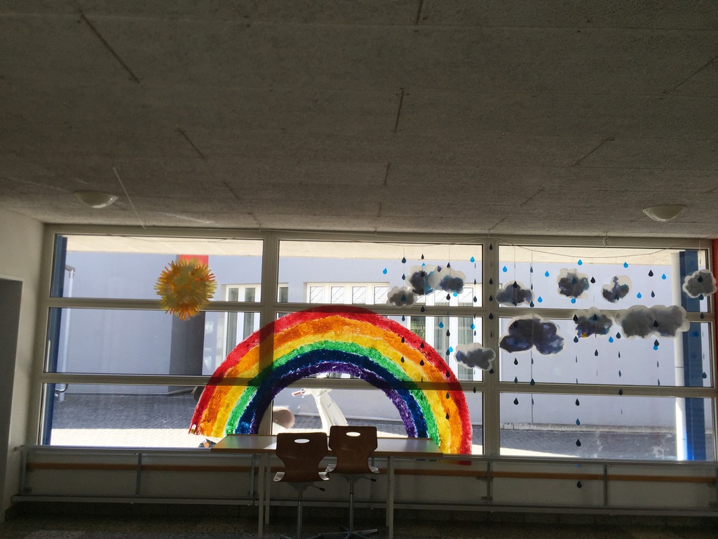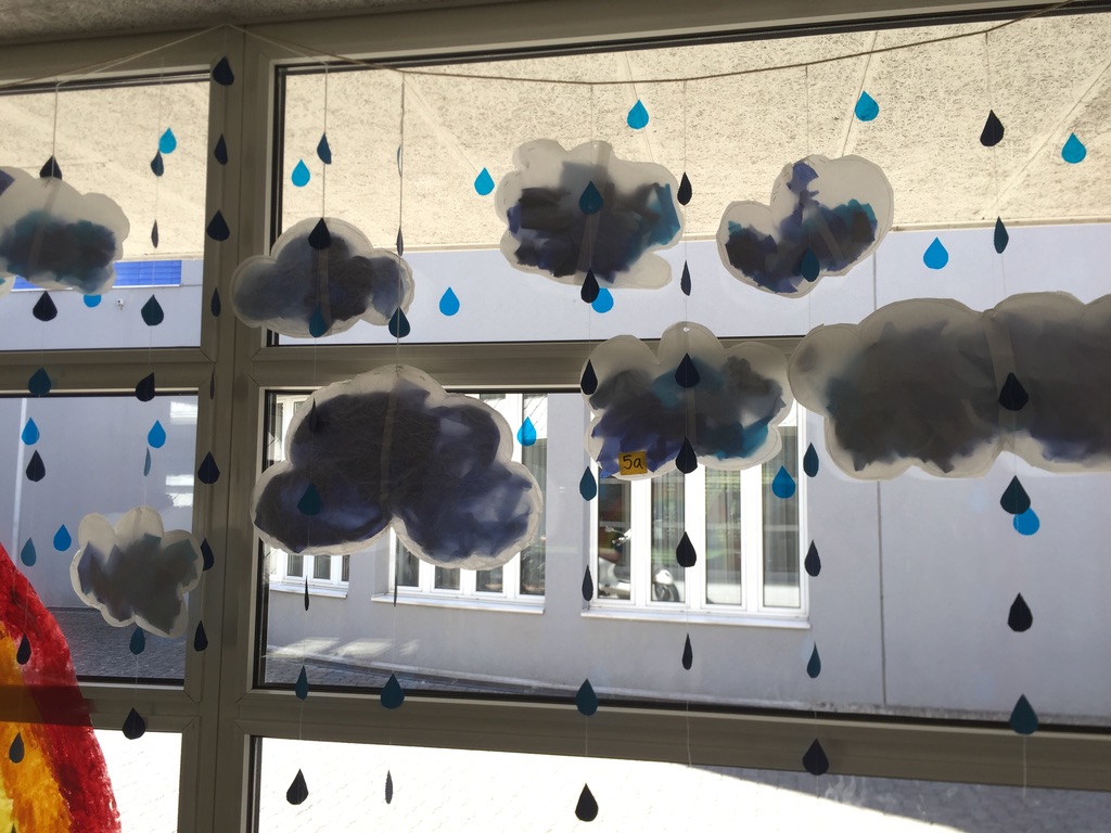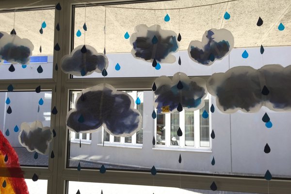 2. und 3. Klassen haben mit Hilfe ihrer Hände Sonnen gestaltet, 4. Klassen die Regenbogen, 5. und 6. Klassen haben mit der Nähmaschine Wolken und Regentropfen gefertigt.