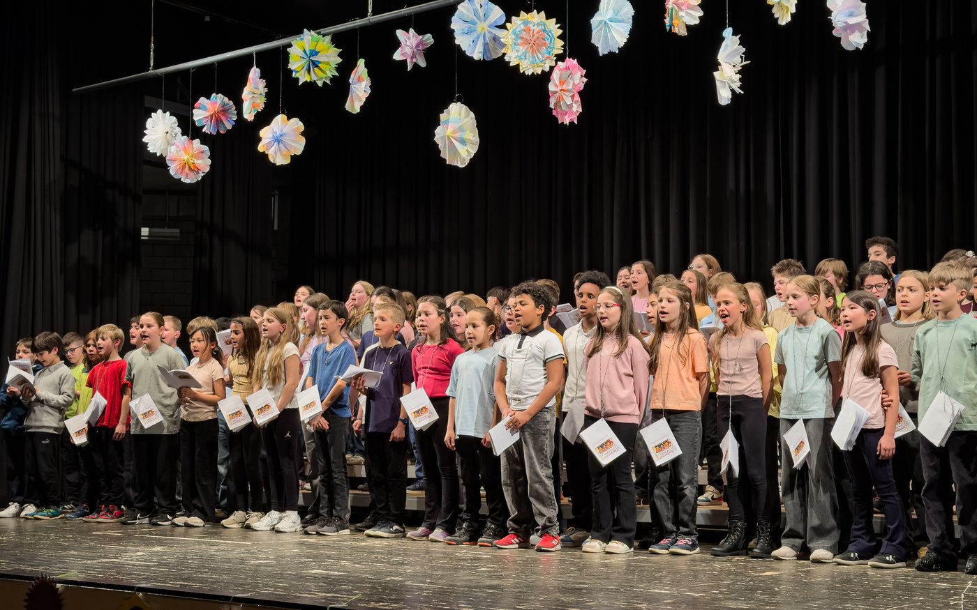 Vor zahlreich erschienenem Publikum – Eltern, Grosseltern, Geschwistern und weiteren Bekannten – zeigten die Kinder eindrücklich, was sie erarbeitet hatten. Mit grosser Freude und sichtbarem Stolz trugen sie ihre Lieder vor und begeisterten die Zuhörerinnen und Zuhörer.