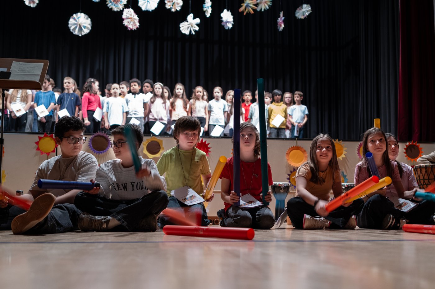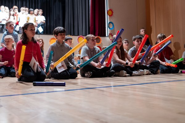 Ein besonderes Highlight war die abwechslungsreiche musikalische Begleitung. Neben klassischen Perkussionsinstrumenten wie Wood Block, Trommeln und Schlaghölzern kamen auch moderne Klänge zum Einsatz: Boomwhacker, Cajon, Trompete und sogar eine E-Gitarre bereicherten die Darbietungen und sorgten für ein vielfältiges Klangbild.