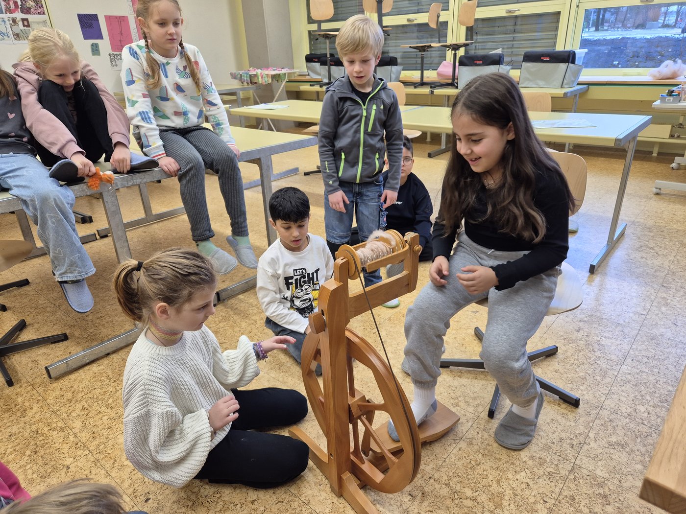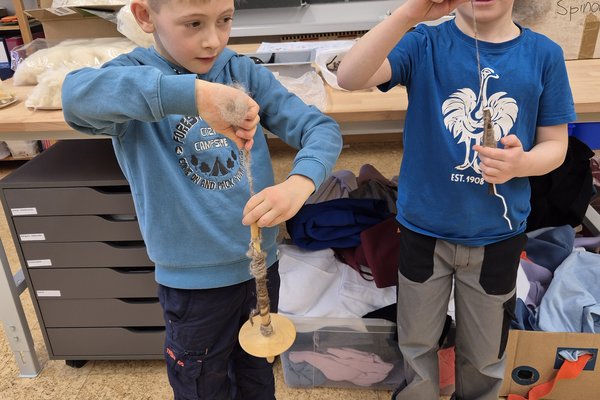 Das Spinnen mit dem Spinnrad war sehr spannend aber auch kompliziert.