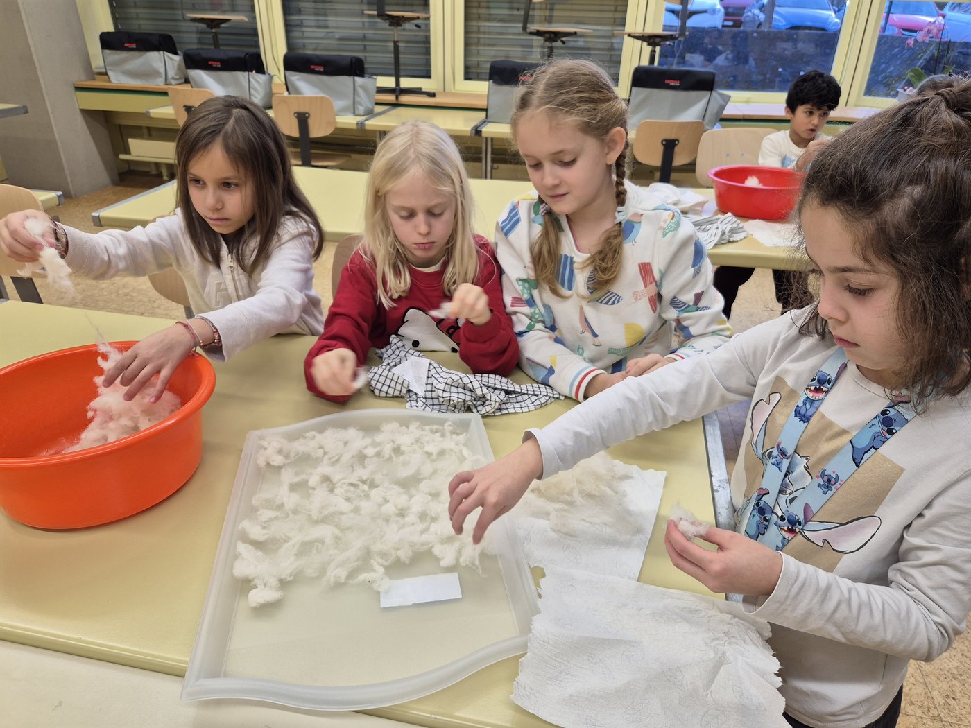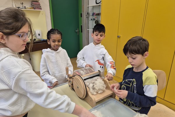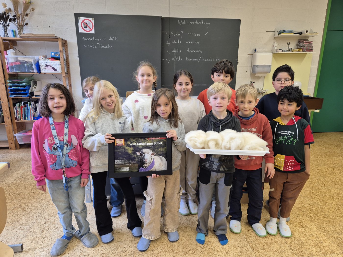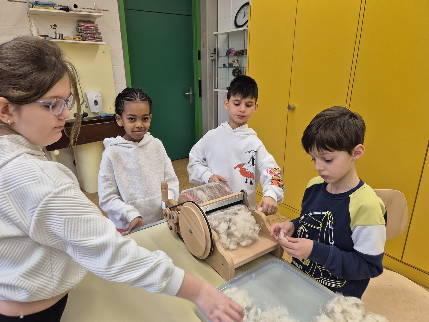 Wir die Klasse 2b haben die Schafwolle gewaschen, getrocknet und gekämmt. Zum Kardieren haben wir auch eine Kardiermaschine gebraucht. Sie hat uns sehr gefallen, aber beim Kämmen hat es manchmal gepiekst.