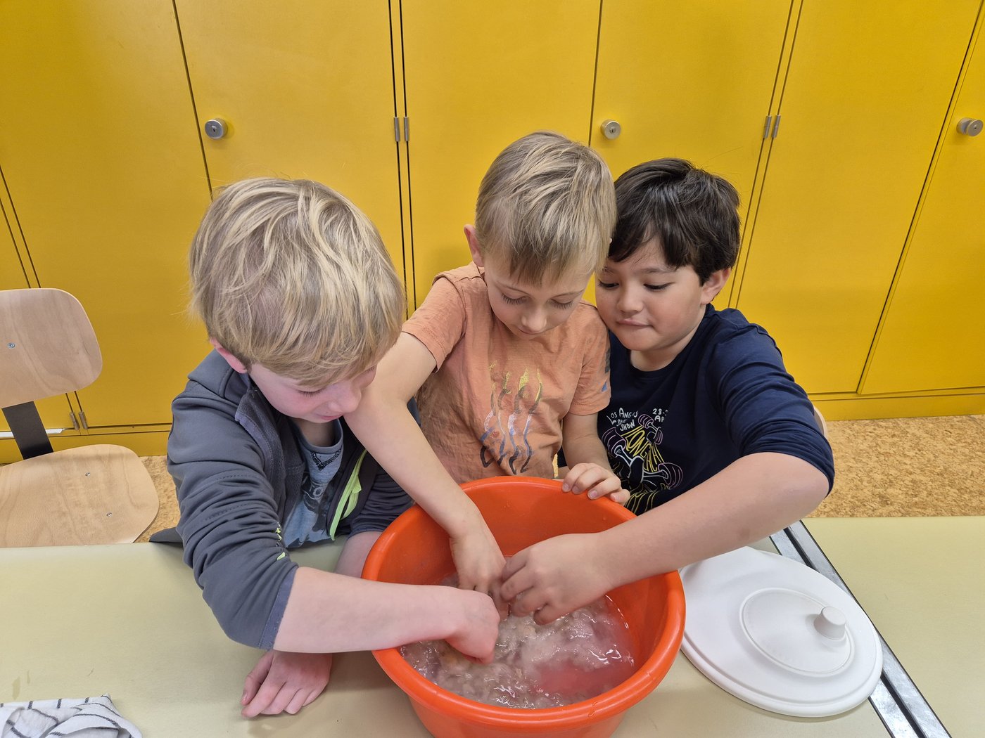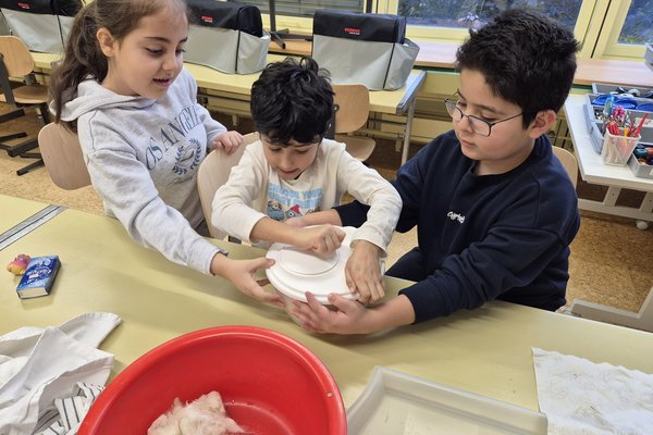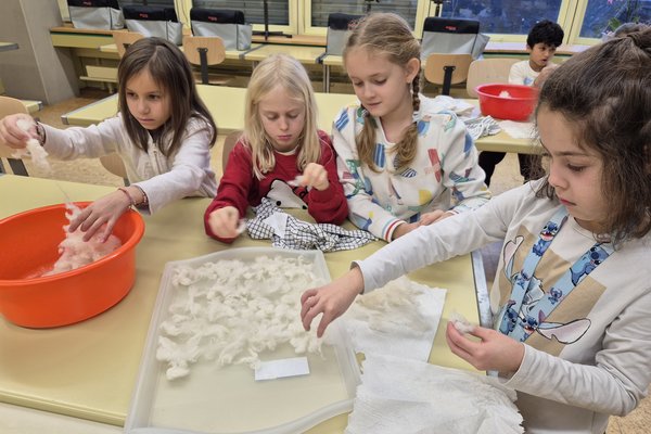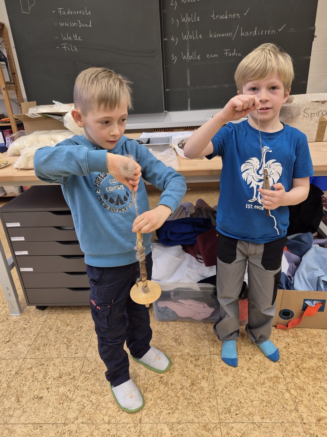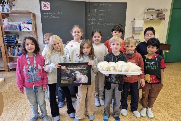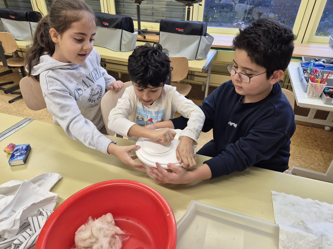 Wir die Klasse 2b haben die Schafwolle gewaschen, getrocknet und gekämmt. Zum Kardieren haben wir auch eine Kardiermaschine gebraucht. Sie hat uns sehr gefallen, aber beim Kämmen hat es manchmal gepiekst.