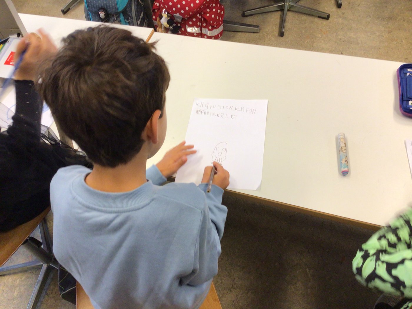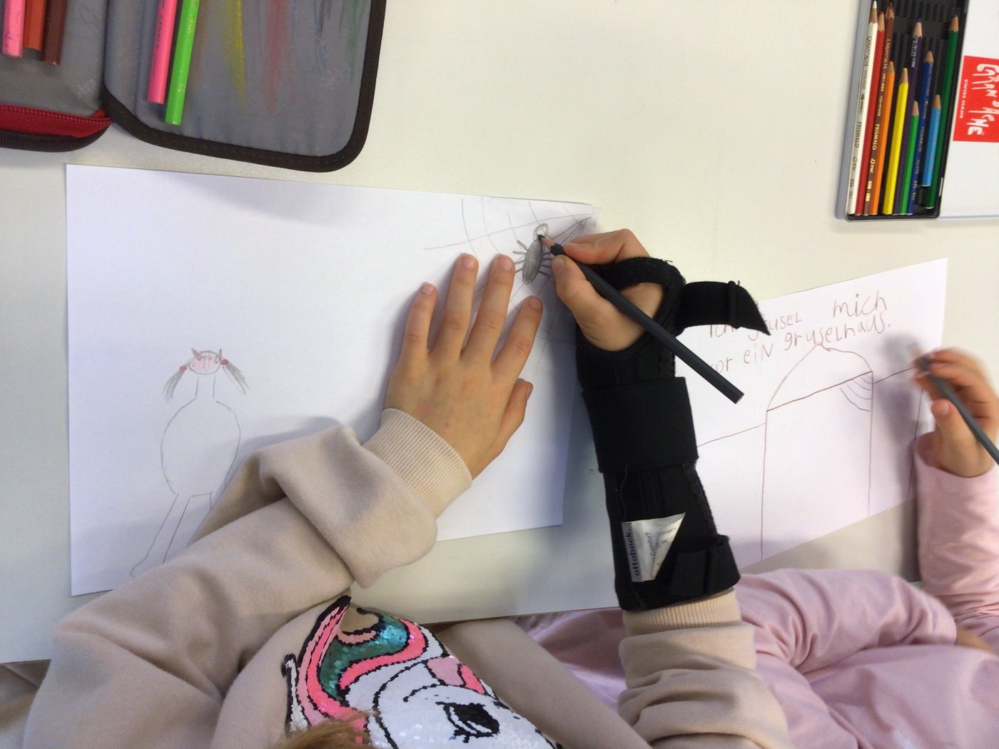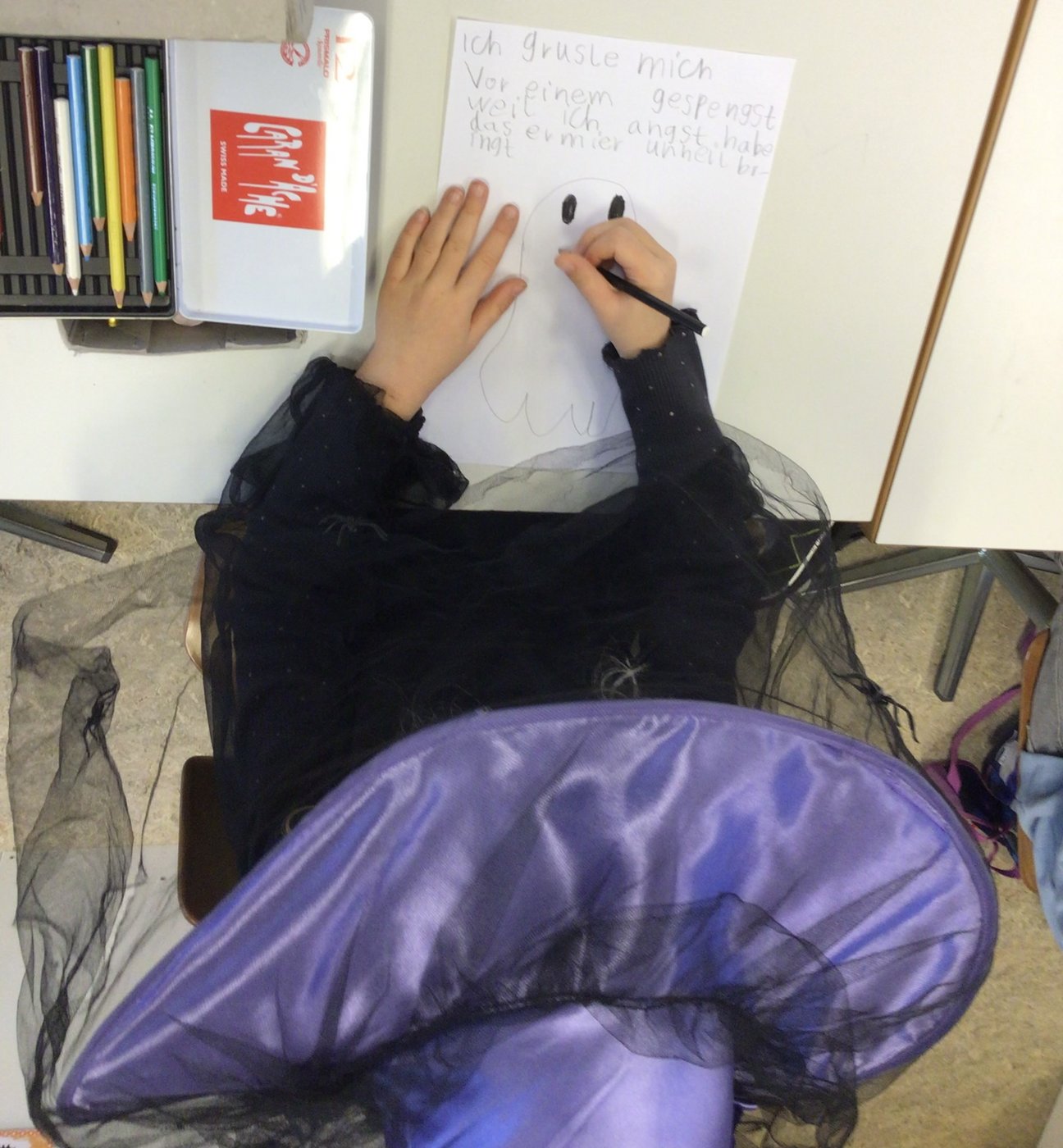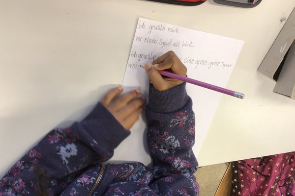 Sofort wurde fleissig gezeichnet sowie geschrieben und bald hatten die Kinder eine grosse Sammlung an gruseligen Dingen zusammengetragen. Sie gruselten sich vor Spinnen, Skeletten, Spukhäuser, Gespenstern, Hexen, allerlei Monstern und sogar die Höhe (Höhenangst) wurde genannt. Beim gemeinsamen Besprechen im Kreis wurde rasch klar, dass jedes Kind etwas gefunden hatte, wovor es sich gruselte. Und dass dies auch völlig in Ordnung ist.