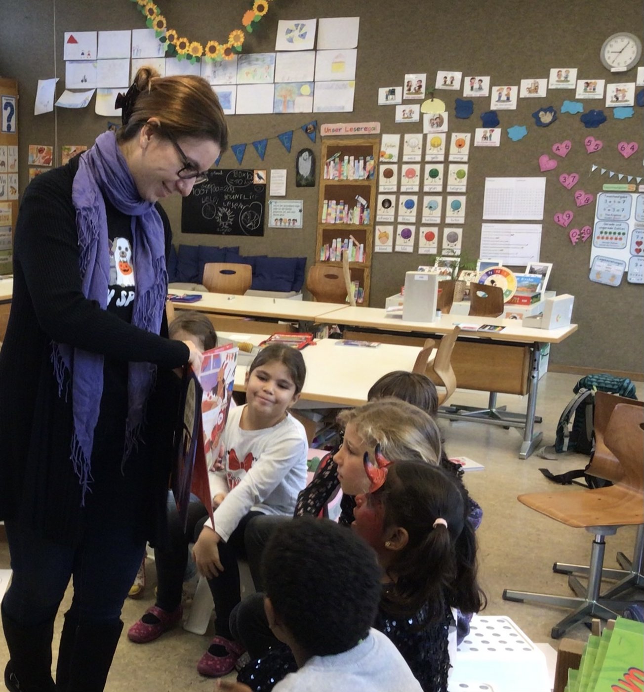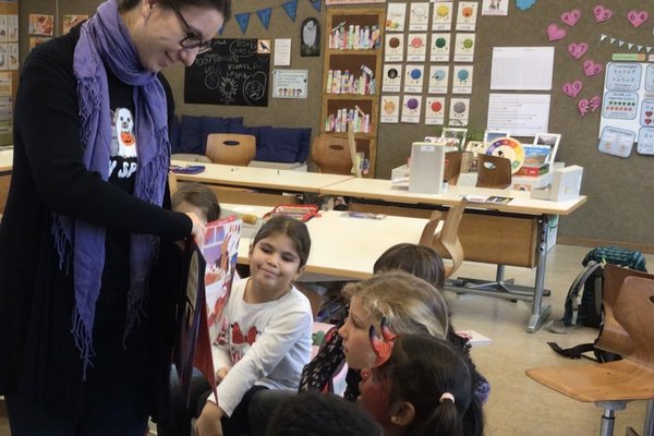Anschliessend hörten die Schülerinnen und Schüler der Geschichte von Fredo Fledermaus interessiert zu. Fredo, welcher eigentlich nur auf der Suche nach neuen Freunden ist, wird von den anderen Tieren als Ungeheuer beschimpft und gemieden. Erst als Betty, eine junge Bärendame, sich bei Fredos zu Hause verirrt, bekommt Fredo plötzlich eine neue Freundin. Und als die anderen Waldtiere Betty angestrengt im Wald suchen und sie bei Fredo finden, werden auch sie überzeugt, dass Fredo überhaupt nicht zum Gruseln ist.